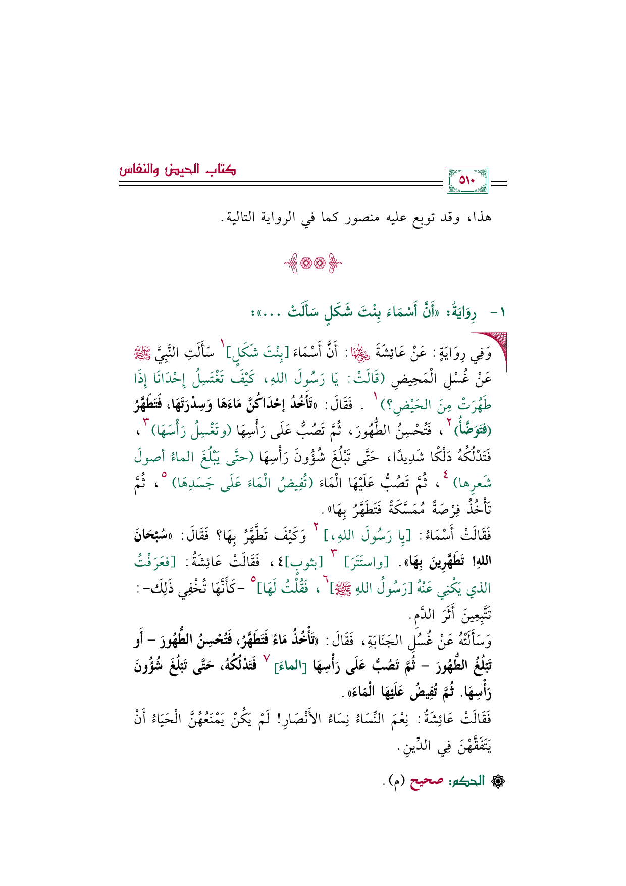 • وَفِي رِوَايَةٍ: عَنْ عَائِشَةَ رَضِيَ اللهُ عَنْهَا: أَنَّ أَسْمَاءَ [بِنْتَ شَكَلٍ] ١ سَأَلَتِ النَّبِيَّ صَلَّى اللهُ عَلَيْهِ وَسَلَّمَ عَنْ غُسْلِ الْمَحِيضِ (قَالَتْ: يَا رَسُولَ اللهِ، كَيْفَ تَغْتَسِلُ إِحْدَانَا إِذَا طَهُرَتْ مِنَ الحَيْضِ؟) ١. فَقَالَ: ((تَأَخُدُ إحْدَاكُنَّ مَاءَهَا وَسِدْرَتَهَا، فَتَطَهَّرُ (فتَوَضَّأُ) ٢، فَتُحْسِنُ الطُّهُورَ، ثُمَّ تَصُبُّ عَلَى رَأْسِهَا (وتَغْسِلُ رَأْسَهَا) ٣، فَتَدْلُكُهُ دَلْكًا شَدِيدًا، حَتَّى تَبْلُغَ شُؤُونَ رَأْسِهَا (حتَّى يَبْلُغَ الماءُ أصولَ شَعرِها) ٤، ثُمَّ تَصُبُّ عَلَيْهَا الْمَاءَ (تُفِيضُ الْمَاءَ عَلَى جَسَدِهَا) ٥، ثُمَّ تَأْخُذُ فِرْصَةً مُمَسَّكَةً فَتَطَهَّرُ بِهَا)).