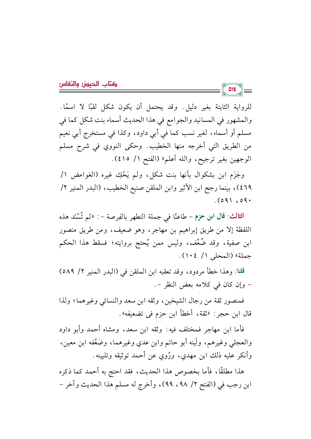 الثالث: قال ابن حزم -طاعنًا في جملة التطهر بالفِرصة-: ((لم تُسْنَد هذه اللفظة إلا من طريق إبراهيم بن مهاجر، وهو ضعيف، ومن طريق منصور بن صفية، وقد ضُعِّف، وليس ممن يُحتج بروايته؛ فسقط هذا الحكم جملة)) (المحلى ١/ ١٠٤).