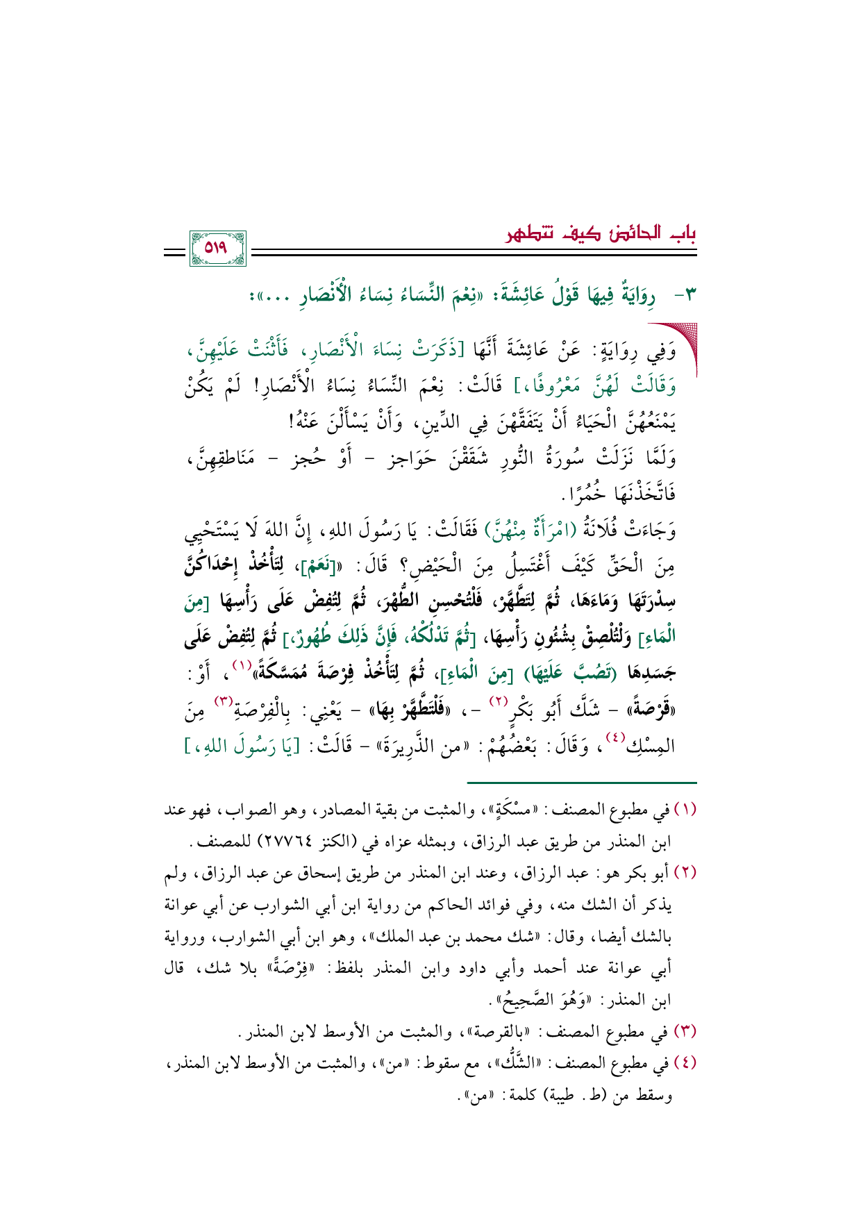 (¬٢) - أبو بكر هو: عبد الرزاق، وعند ابن المنذر من طريق إسحاق عن عبد الرزاق، ولم يذكر أن الشك منه، وفي فوائد الحاكم من رواية ابن أبي الشوارب عن أبي عوانة بالشك أيضا، وقال: ((شك محمد بن عبد الملك))، وهو ابن أبي الشوارب، ورواية أبي عوانة عند أحمد وأبي داود وابن المنذر بلفظ: ((فِرْصَةً)) بلا شك، قال ابن المنذر: ((وَهُوَ الصَّحِيحُ".