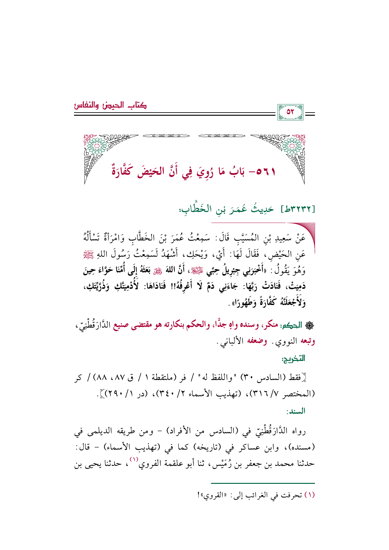 ◼ عَنْ سَعِيدِ بْنِ المُسَيَّبِ قَالَ: سَمِعْتُ عُمَرَ بْنَ الخَطَّابِ وَامْرَأةٌ تَسْأَلُهُ عَنِ الحَيْضِ، فَقَالَ لَهَا: أَيْ، وَيْحَكِ، أَشْهَدُ لَسَمِعْتُ رَسُولَ اللهِ صَلَّى اللهُ عَلَيْهِ وَسَلَّمَ وَهُوَ يَقُولُ: ((أَخْبَرَنِي جِبْرِيلُ حِبِّي عَلَيْهِ السَّلَامُ، أَنَّ اللهَ عَزَّ وَجَلَّ بَعَثَهُ إِلَى أُمِّنَا حَوَّاءَ حِينَ دَمِيَتْ، فَنَادَتْ رَبَّهَا: جَاءَنِي دَمٌ لَا أَعْرِفُهُ! ! فَنَادَاهَا: لَأُدْمِيَنَّكِ وَذُرَّيِّتَكِ، وَلَأَجْعَلَنَّهُ كَفَّارَةً وَطَهُورًا)).