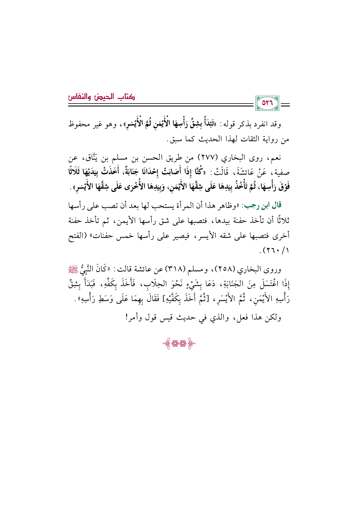 قال ابن رجب: ((وظاهر هذا أن المرأة يستحب لها بعد أن تصب على رأسها ثلاثًا أن تأخذ حفنة بيدها، فتصبها على شق رأسها الأيمن، ثم تأخذ حفنة أخرى فتصبها على شقه الأيسر، فيصير على رأسها خمس حفنات)) (الفتح ١/ ٢٦٠).