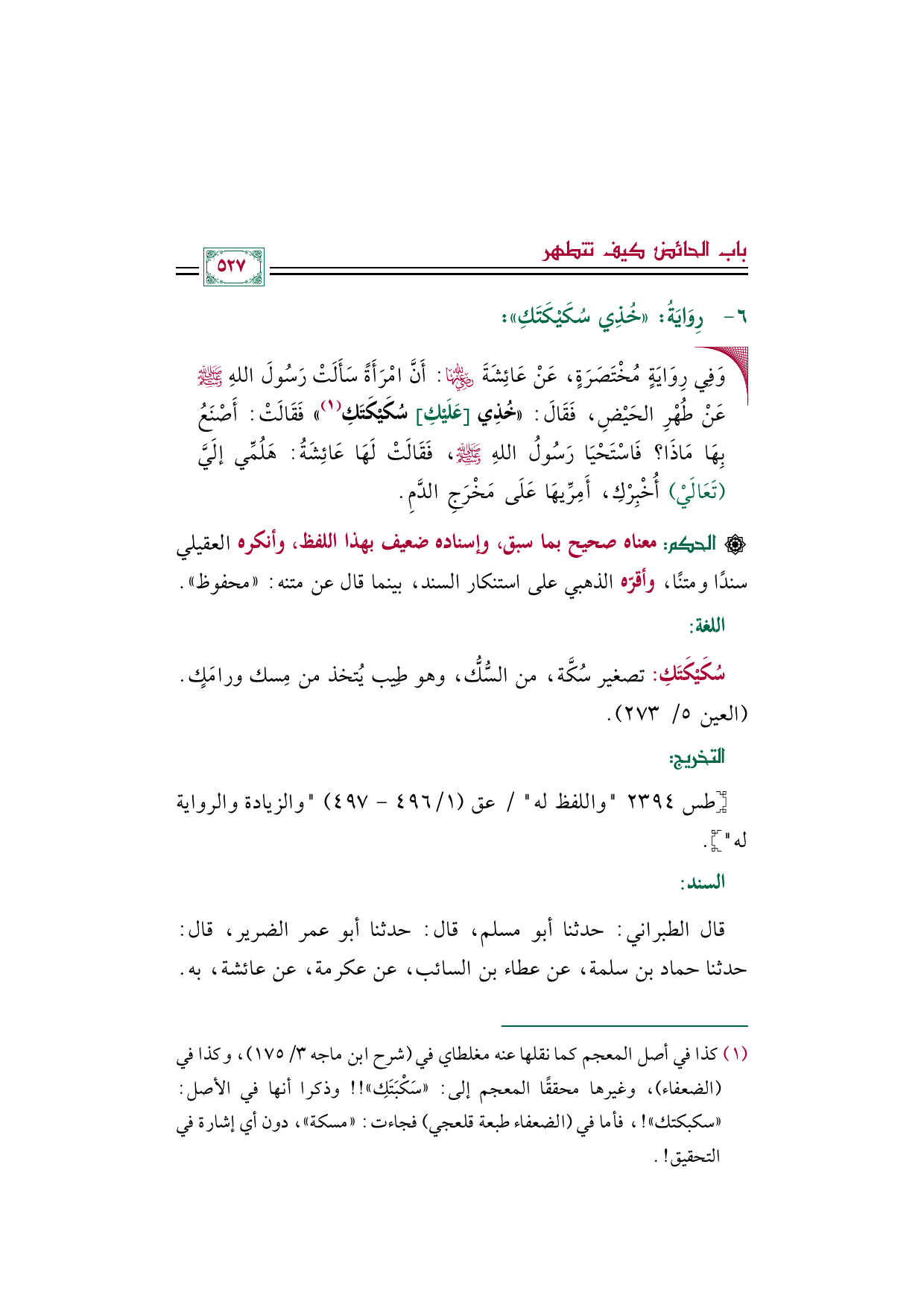 (¬١) - كذا في أصل المعجم كما نقلها عنه مغلطاي في (شرح ابن ماجه ٣/ ١٧٥)، وكذا في (الضعفاء)، وغيرها محققًا المعجم إلى: ((سَكْبَتَكِ"!! وذكرا أنها في الأصل: ((سكبكتك"!، فأما في (الضعفاء طبعة قلعجي) فجاءت: ((مسكة))، دون أي إشارة في التحقيق!.