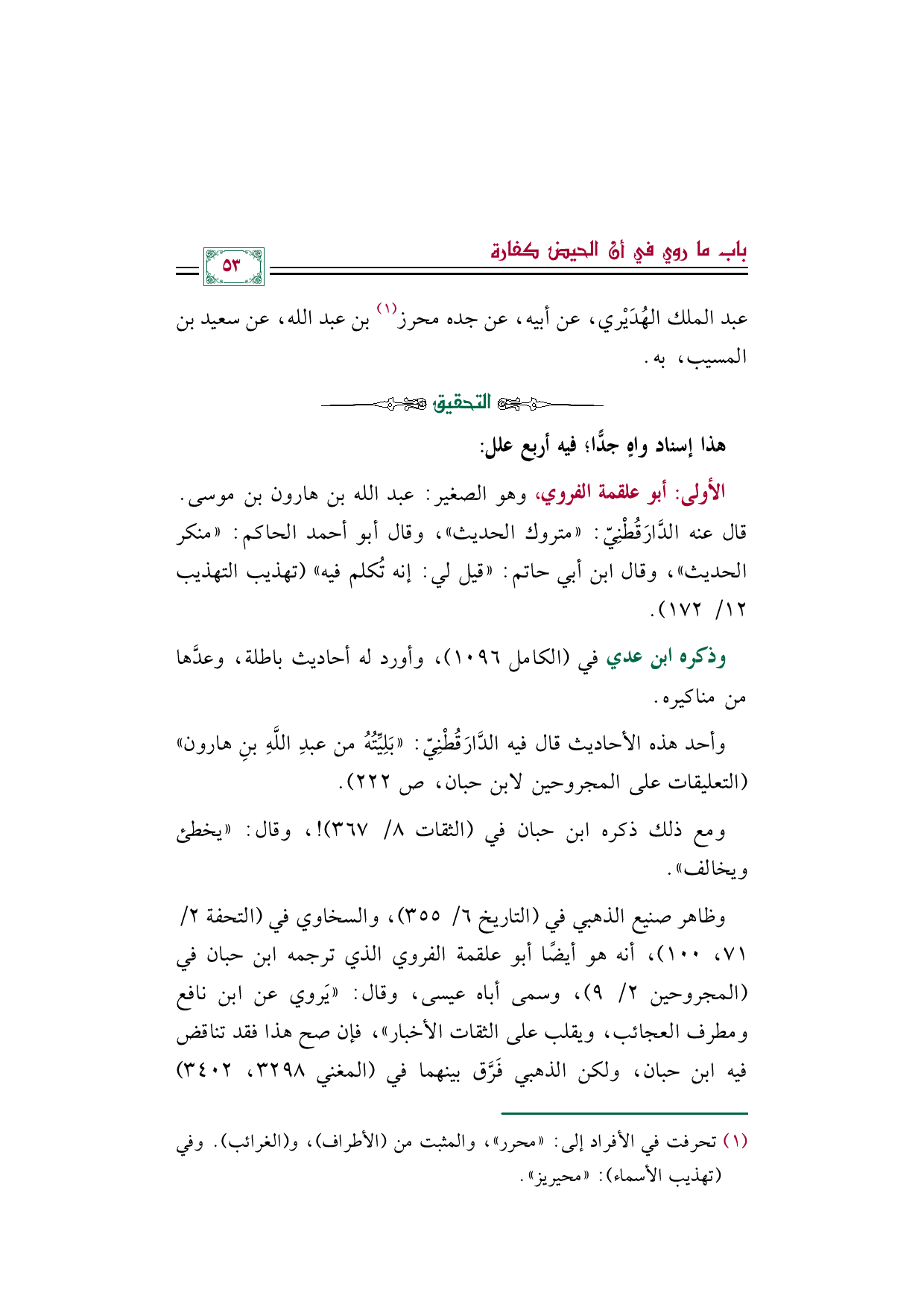 الأولى: أبو علقمة الفروي، وهو الصغير: عبد الله بن هارون بن موسى. قال عنه الدَّارَقُطْنِيّ: ((متروك الحديث))، وقال أبو أحمد الحاكم: ((منكر الحديث))، وقال ابن أبي حاتم: ((قيل لي: إنه تُكلم فيه)) (تهذيب التهذيب ١٢/ ١٧٢).
