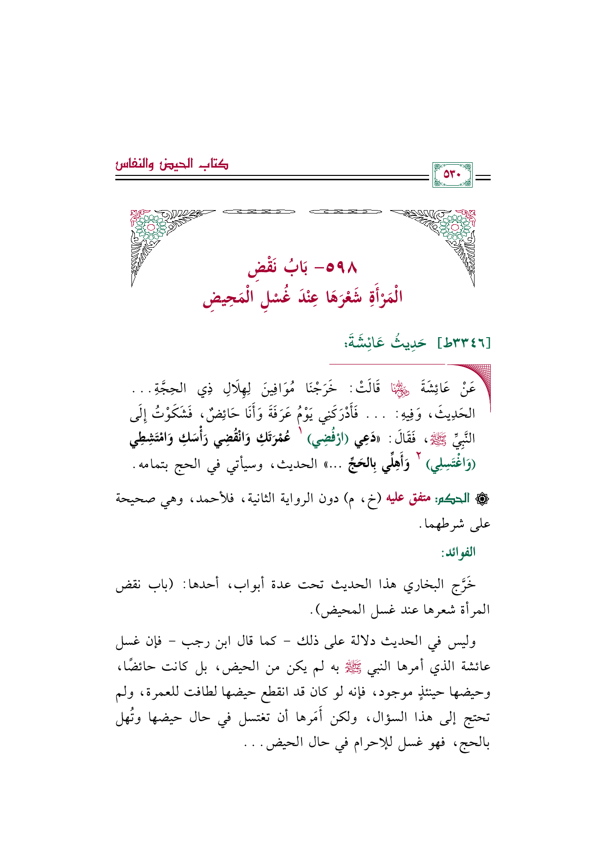 وليس في الحديث دلالة على ذلك - كما قال ابن رجب - فإن غسل عائشة الذي أمرها النبي صلى الله عليه وسلم به لم يكن من الحيض، بل كانت حائضًا، وحيضها حينئذٍ موجود، فإنه لو كان قد انقطع حيضها لطافت للعمرة، ولم تحتج إلى هذا السؤال، ولكن أَمَرها أن تغتسل في حال حيضها وتُهل بالحج، فهو غسل للإحرام في حال الحيض ...