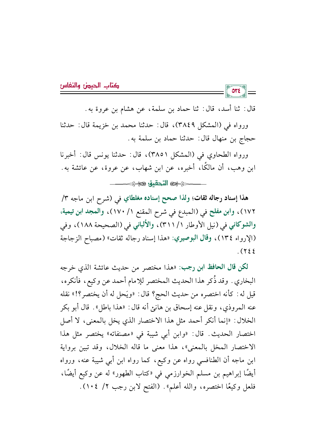 لكن قال الحافظ ابن رجب: ((هذا مختصر من حديث عائشة الذي خرجه البخاري. وقد ذُكر هذا الحديث المختصر للإمام أحمد عن وكيع، فأنكره، قيل له: كأنه اختصره من حديث الحج؟ قال: ((ويَحل له أن يختصر؟ ! )) نقله عنه المروذي، ونقل عنه إسحاق بن هانئ أنه قال: ((هذا باطل)). قال أبو بكر الخلال: ((إنما أنكر أحمد مثل هذا الاختصار الذي يخل بالمعنى، لا أصل اختصار الحديث. قال: ((وابن أبي شيبة في ((مصنفاته)) يختصر مثل هذا الاختصار المخل بالمعنى))، هذا معنى ما قاله الخلال، وقد تبين برواية ابن ماجه أن الطنافسي رواه عن وكيع، كما رواه ابن أبي شيبة عنه، ورواه أيضًا إبراهيم بن مسلم الخوارزمي في ((كتاب الطهور)) له عن وكيع أيضًا، فلعل وكيعًا اختصره، والله أعلم)). (الفتح لابن رجب ٢/ ١٠٤).