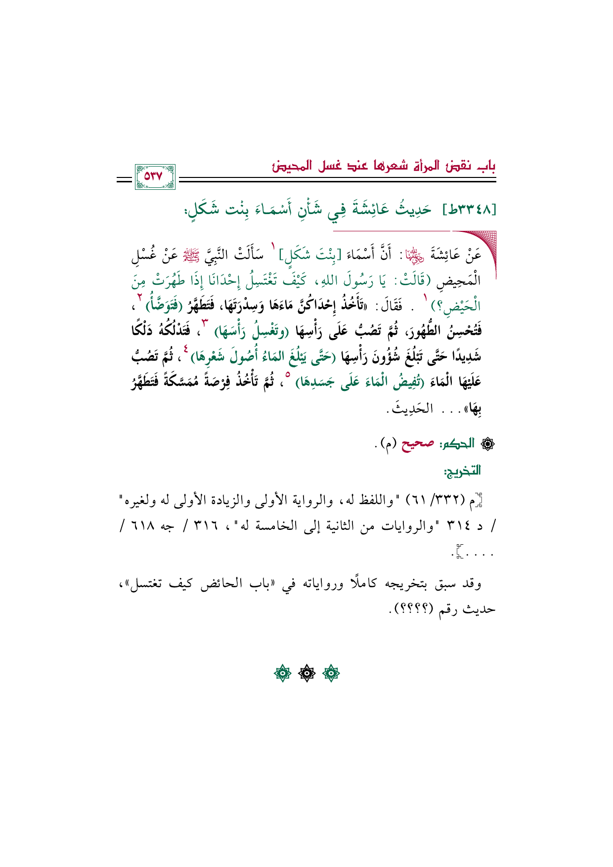 ◼ عَنْ عَائِشَةَ رَضِيَ اللهُ عَنْهَا: أَنَّ أَسْمَاءَ [بِنْتَ شَكَلٍ] ١ سَأَلَتْ النَّبِيَّ صَلَّى اللهُ عَلَيْهِ وَسَلَّمَ عَنْ غُسْلِ الْمَحِيضِ (قَالَتْ: يَا رَسُولَ اللهِ، كَيْفَ تَغْتَسِلُ إِحْدَانَا إِذَا طَهُرَتْ مِنَ الْحَيْضِ؟ ) ١. فَقَالَ: ((تَأَخُذُ إِحْدَاكُنَّ مَاءَهَا وَسِدْرَتَهَا، فَتَطَهَّرُ (فَتَوَضَّأُ) ٢، فَتُحْسِنُ الطُّهُورَ، ثُمَّ تَصُبُّ عَلَى رَأْسِهَا (وتَغْسِلُ رَأْسَهَا) ٣، فَتَدْلُكُهُ دَلْكًا شَدِيدًا حَتَّى تَبْلُغَ شُؤُونَ رَأْسِهَا (حَتَّى يَبْلُغَ المَاءُ أُصُولَ شَعْرِهَا) ٤، ثُمَّ تَصُبُّ عَلَيْهَا الْمَاءَ (تُفِيضُ الْمَاءَ عَلَى جَسَدِهَا) ٥، ثُمَّ تَأْخُذُ فِرْصَةً مُمَسَّكَةً فَتَطَهَّرُ بِهَا)) ... الحَدِيثَ.
