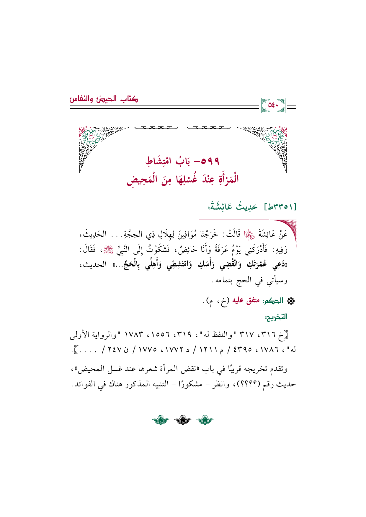 وتقدم تخريجه قريبًا في باب (نقض المرأة شعرها عند غسل المحيض)، حديث رقم (؟ ؟ ؟ ؟ )، وانظر - مشكورًا - التنبيه المذكور هناك في الفوائد.