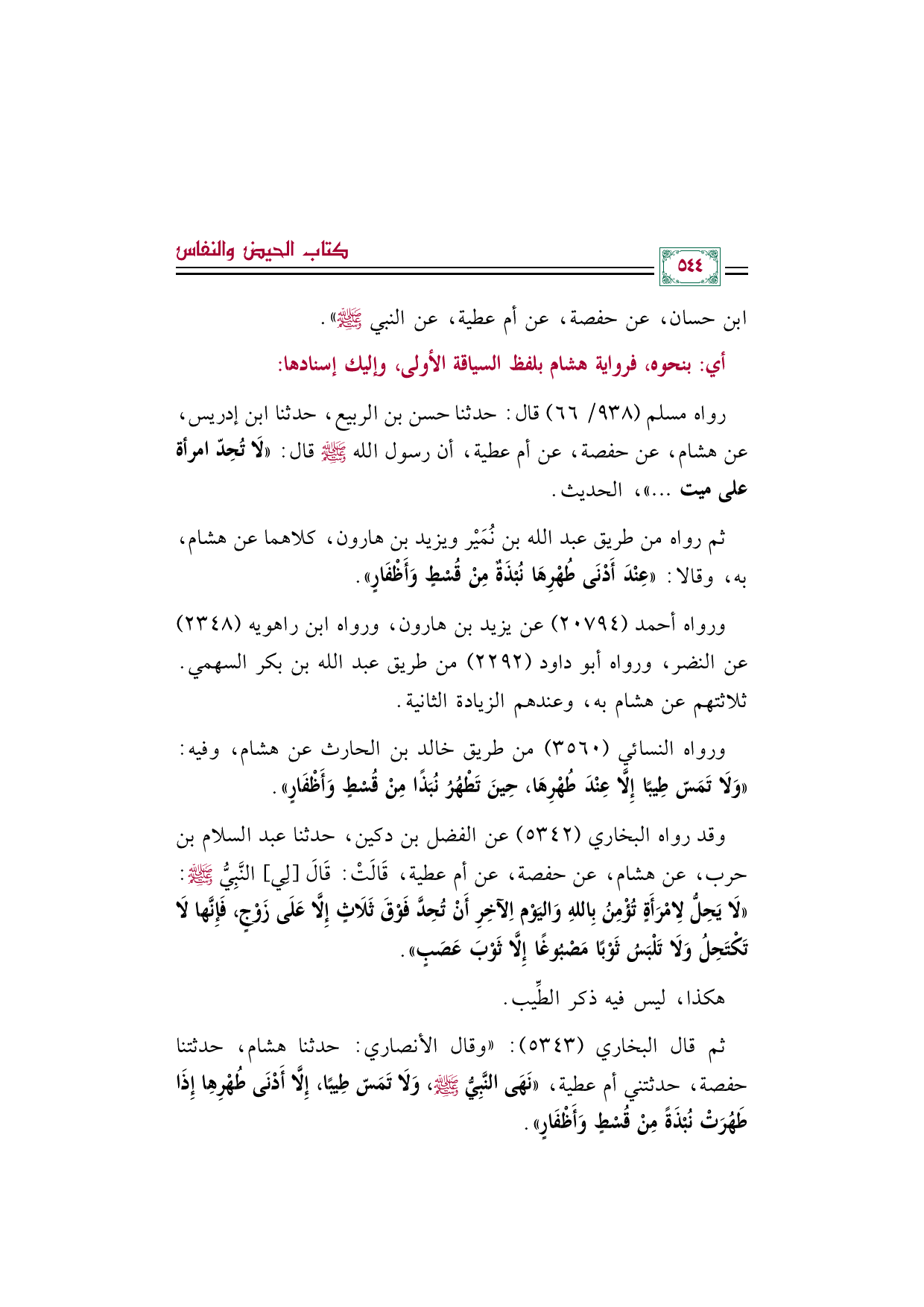 ثم قال البخاري (٥٣٤٣): ((وقال الأنصاري: حدثنا هشام، حدثتنا حفصة، حدثتني أم عطية، ((نَهَى النَّبِيُّ صَلَّى اللهُ عَلَيْهِ وَسَلَّمَ، وَلَا تَمَسّ طِيبًا، إِلَّا أَدْنَى طُهْرِهِا إِذَا طَهُرَتْ نُبْذَةً مِنْ قُسْطٍ وَأَظْفَارٍ)).