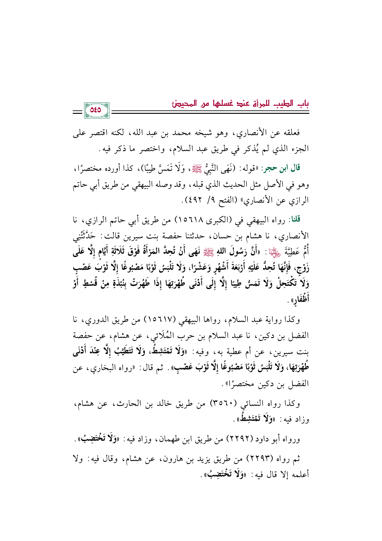 قلنا: رواه البيهقي في (الكبرى ١٥٦١٨) من طريق أبي حاتم الرازي، نا الأنصاري، نا هشام بن حسان، حدثتنا حفصة بنت سيرين قالت: حَدَّثَتْنِي أُمُّ عَطِيَّةَ رَضِيَ اللهُ عَنْهَا: ((أَنَّ رَسُولَ اللهِ صَلَّى اللهُ عَلَيْهِ وَسَلَّمَ نَهَى أَنْ تُحِدَّ المَرْأَةُ فَوْقَ ثَلَاثَةِ أَيَّامٍ إِلَّا عَلَى زَوْجٍ، فَإِنَّهَا تُحِدُّ عَلَيْهِ أَرْبَعَةَ أَشْهُرٍ وَعَشْرًا، وَلَا تَلْبَسُ ثَوْبًا مَصْبُوغًا إِلَّا ثَوْبَ عَصْبٍ وَلَا تَكْتَحِلْ وَلَا تَمَسُّ طِيبًا إِلَّا إِلَى أَدْنَى طُهْرَتِهَا إِذَا طَهُرَتْ بِنُبْذَةٍ مِنْ قُسْطٍ أَوْ أَظْفَارٍ)).