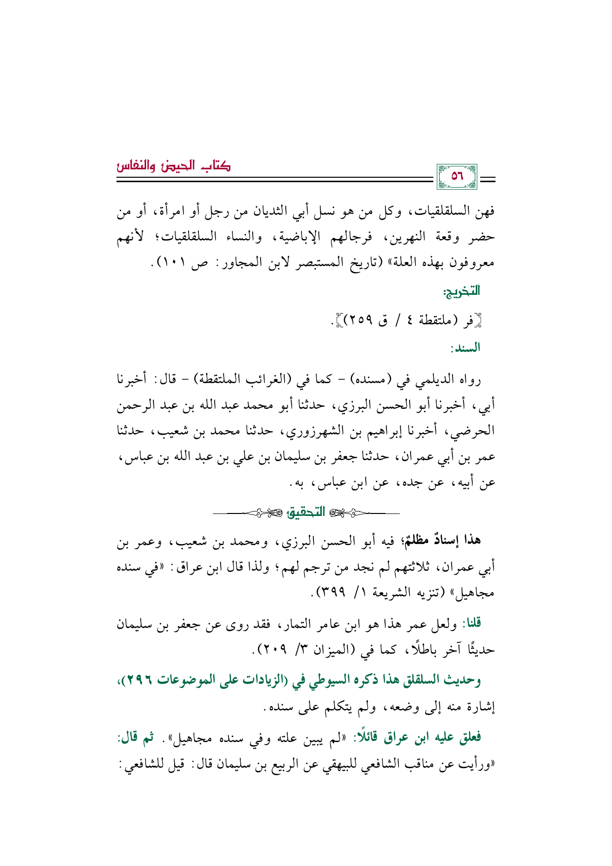 فعلق عليه ابن عراق قائلًا: ((لم يبين علته وفي سنده مجاهيل)). ثم قال: ((ورأيت عن مناقب الشافعي للبيهقي عن الربيع بن سليمان قال: قيل للشافعي: