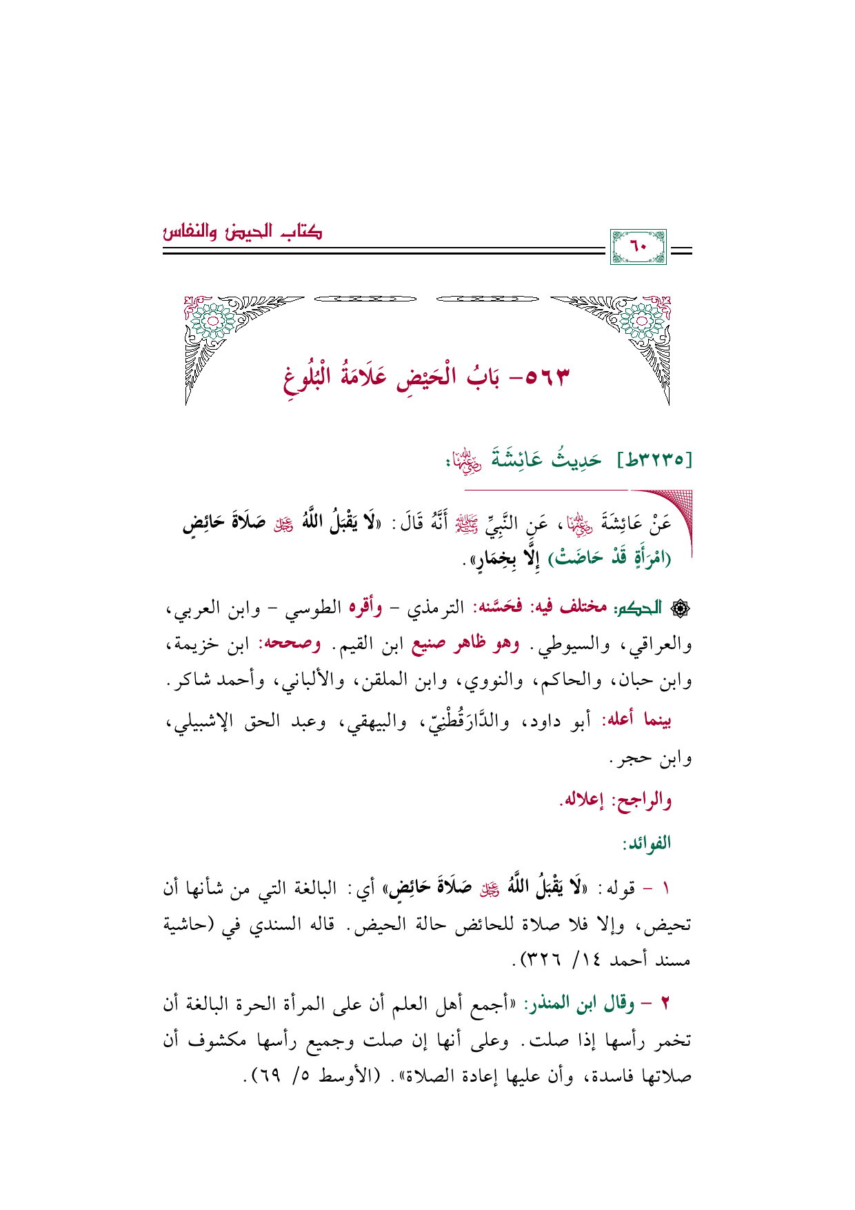 ١ - قوله: ((لَا يَقْبَلُ اللَّهُ عَزَّ وَجَلَّ صَلَاةَ حَائِضٍ)) أي: البالغة التي من شأنها أن تحيض، وإلا فلا صلاة للحائض حالة الحيض. قاله السندي في (حاشية مسند أحمد ١٤/ ٣٢٦).