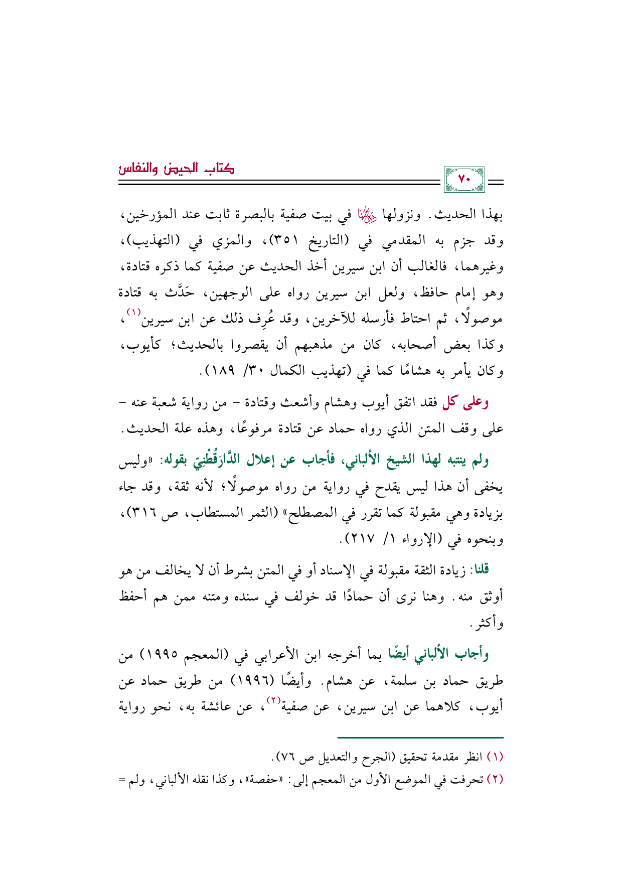 وأجاب الألباني أيضًا بما أخرجه ابن الأعرابي في (المعجم ١٩٩٥) من طريق حماد بن سلمة، عن هشام. وأيضًا (١٩٩٦) من طريق حماد عن أيوب، كلاهما عن ابن سيرين، عن صفية (¬٢)، عن عائشة به، نحو رواية