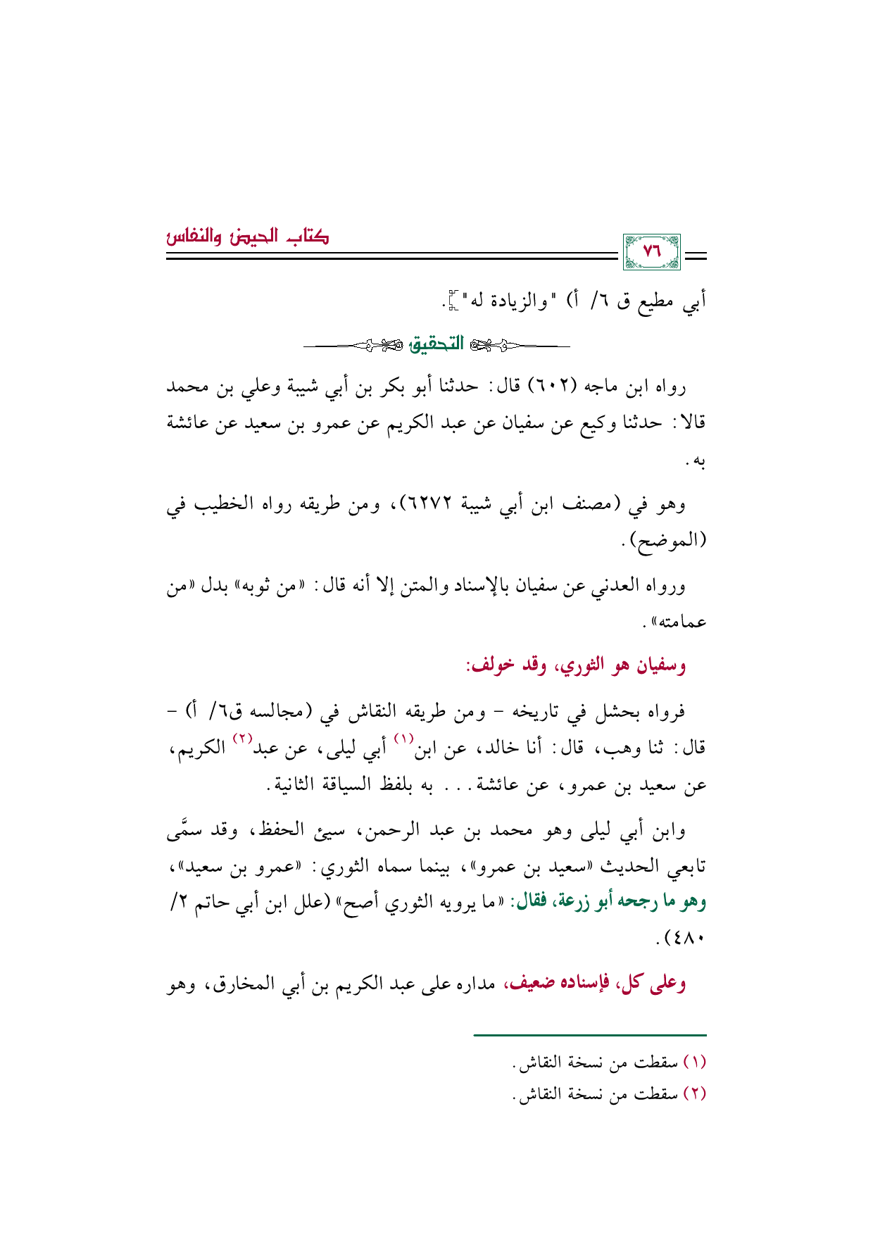 رواه ابن ماجه (٦٠٢) قال: حدثنا أبو بكر بن أبي شيبة وعلي بن محمد قالا: حدثنا وكيع عن سفيان عن عبد الكريم عن عمرو بن سعيد عن عائشة به.