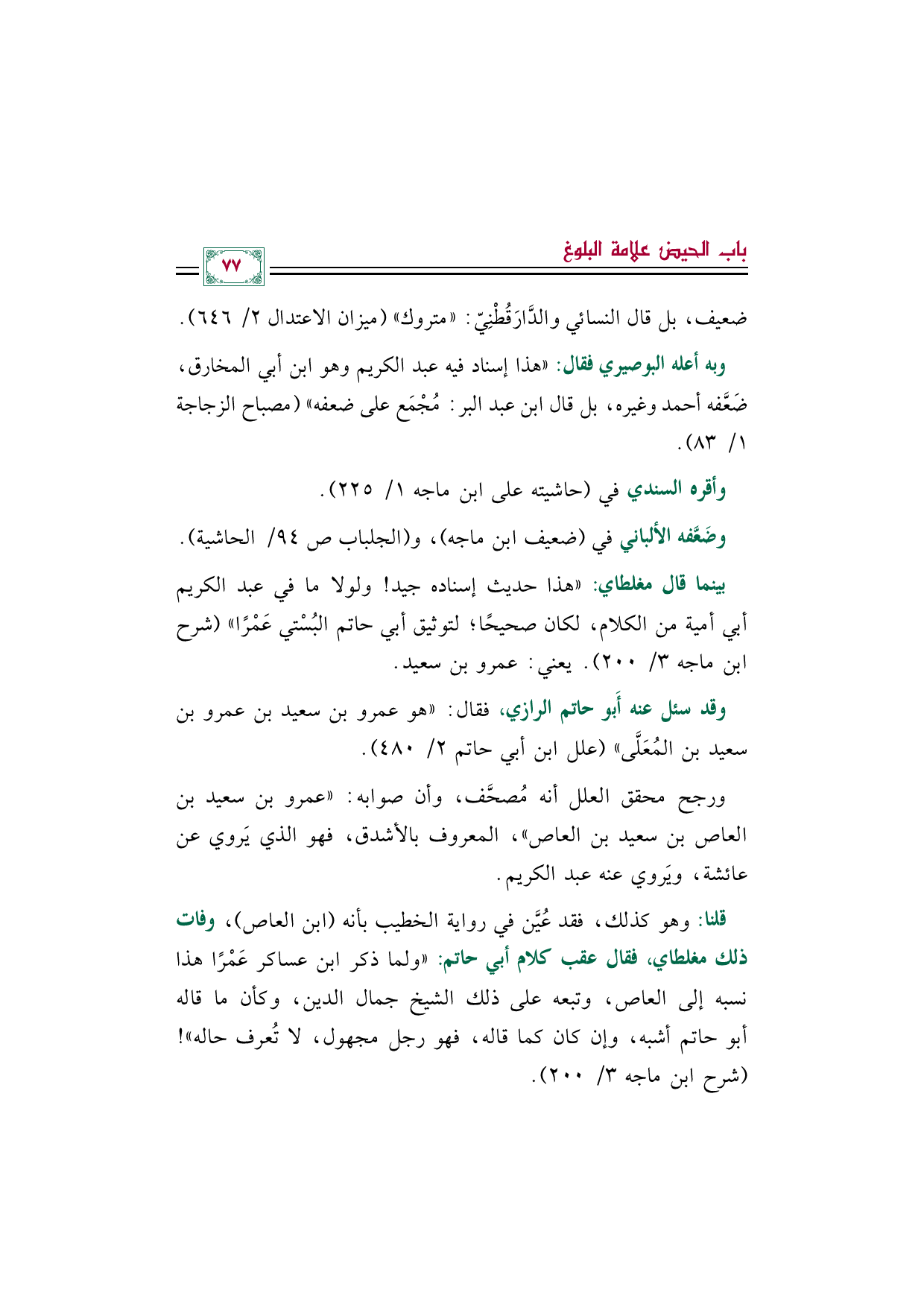 بينما قال مغلطاي: ((هذا حديث إسناده جيد! ولولا ما في عبد الكريم أبي أمية من الكلام، لكان صحيحًا؛ لتوثيق أبي حاتم البُسْتي عَمْرًا)) (شرح ابن ماجه ٣/ ٢٠٠). يعني: عمرو بن سعيد.
