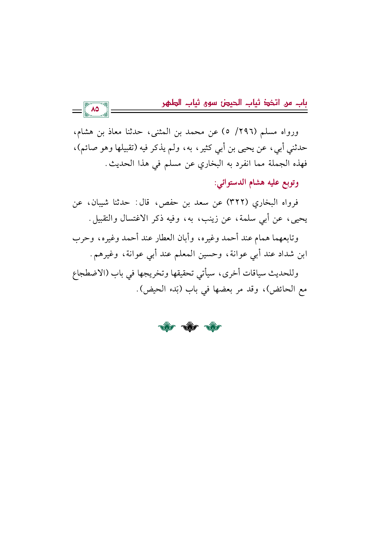 وللحديث سياقات أخرى، سيأتي تحقيقها وتخريجها في باب (الاضطجاع مع الحائض)، وقد مر بعضها في باب (بَدء الحيض).