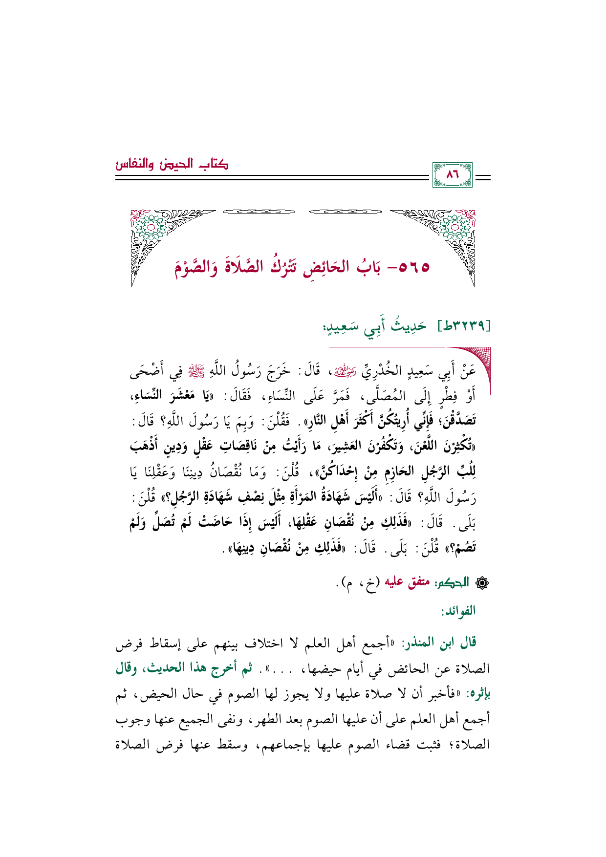 قال ابن المنذر: "أجمع أهل العلم لا اختلاف بينهم على إسقاط فرض الصلاة عن الحائض في أيام حيضها، ... ". ثم أخرج هذا الحديث، وقال بإثره: "فأخبر أن لا صلاة عليها ولا يجوز لها الصوم في حال الحيض، ثم أجمع أهل العلم على أن عليها الصوم بعد الطهر، ونفى الجميع عنها وجوب الصلاة؛ فثبت قضاء الصوم عليها بإجماعهم، وسقط عنها فرض الصلاة
