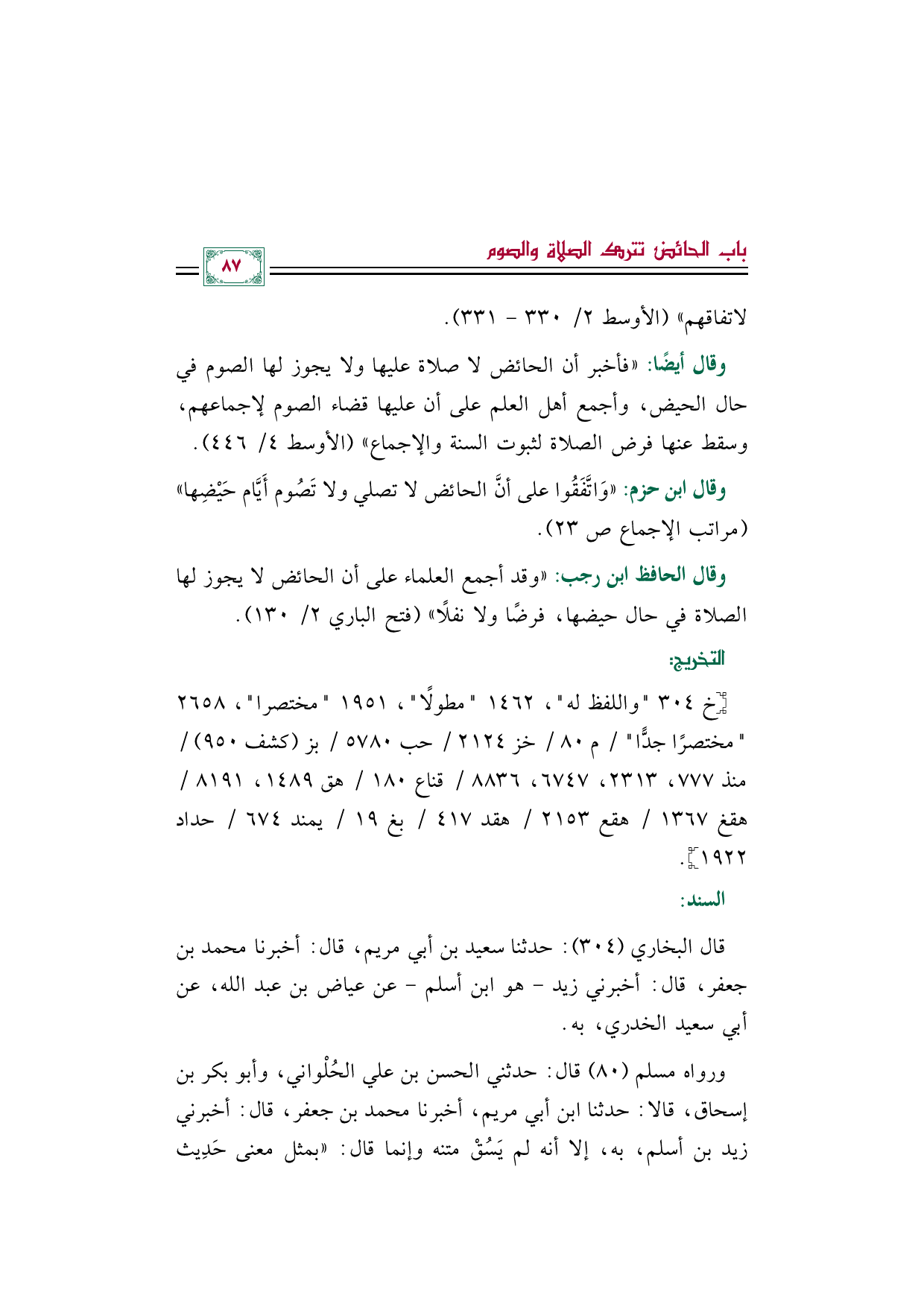 وقال ابن حزم: "وَاتَّفَقُوا على أنَّ الحائض لا تصلي ولا تَصُوم أَيَّام حَيْضِها" (مراتب الإجماع ص ٢٣).