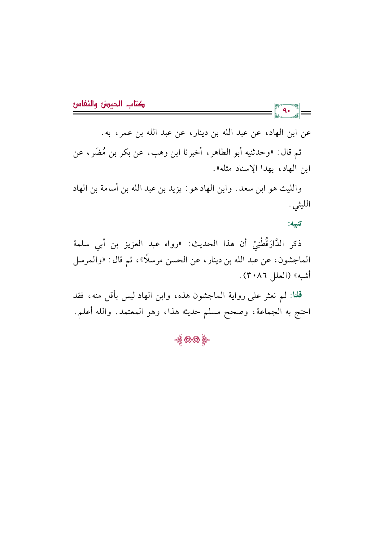 قلنا: لم نعثر على رواية الماجشون هذه، وابن الهاد ليس بأقل منه، فقد احتج به الجماعة، وصحح مسلم حديثه هذا، وهو المعتمد. والله أعلم.