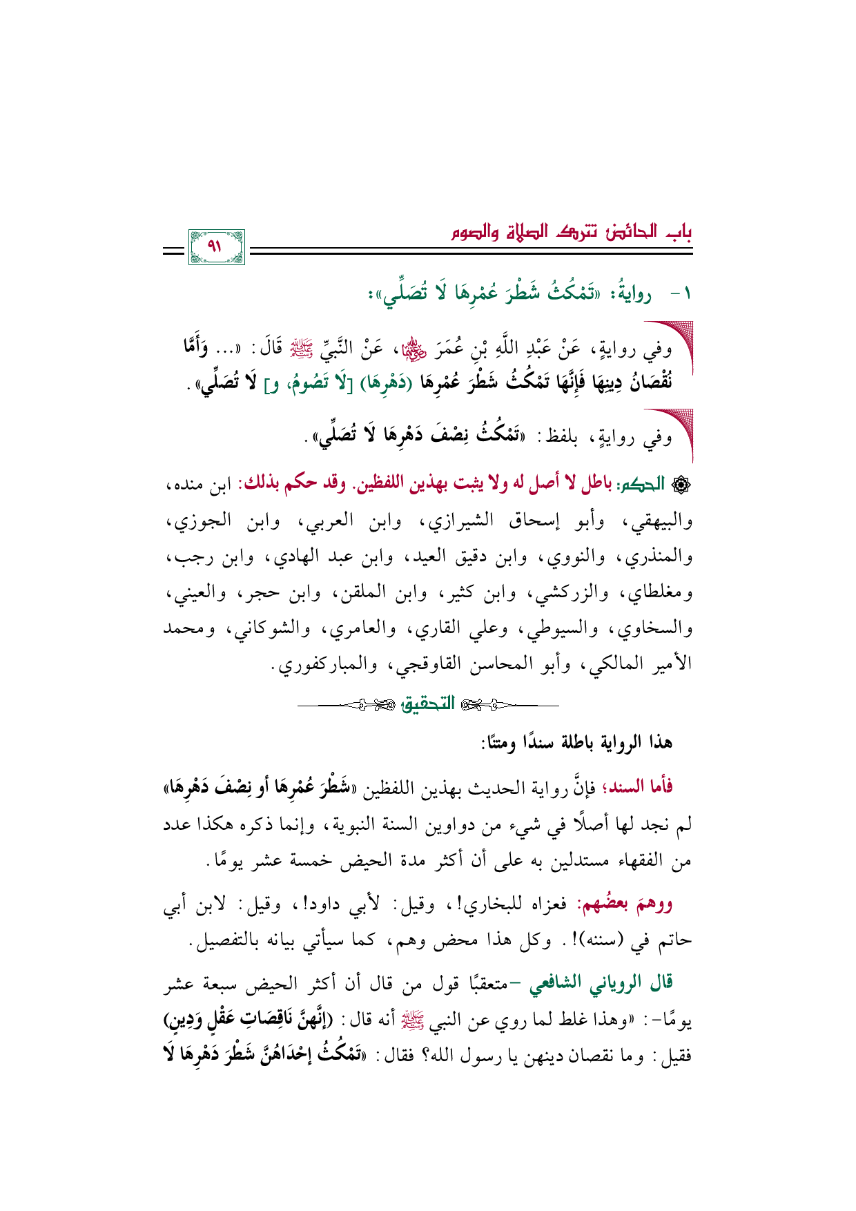 فأما السند؛ فإنَّ رواية الحديث بهذين اللفظين ((شَطْرَ عُمْرِهَا أو نِصْفَ دَهْرِهَا)) لم نجد لها أصلًا في شيء من دواوين السنة النبوية، وإنما ذكره هكذا عدد من الفقهاء مستدلين به على أن أكثر مدة الحيض خمسة عشر يومًا.