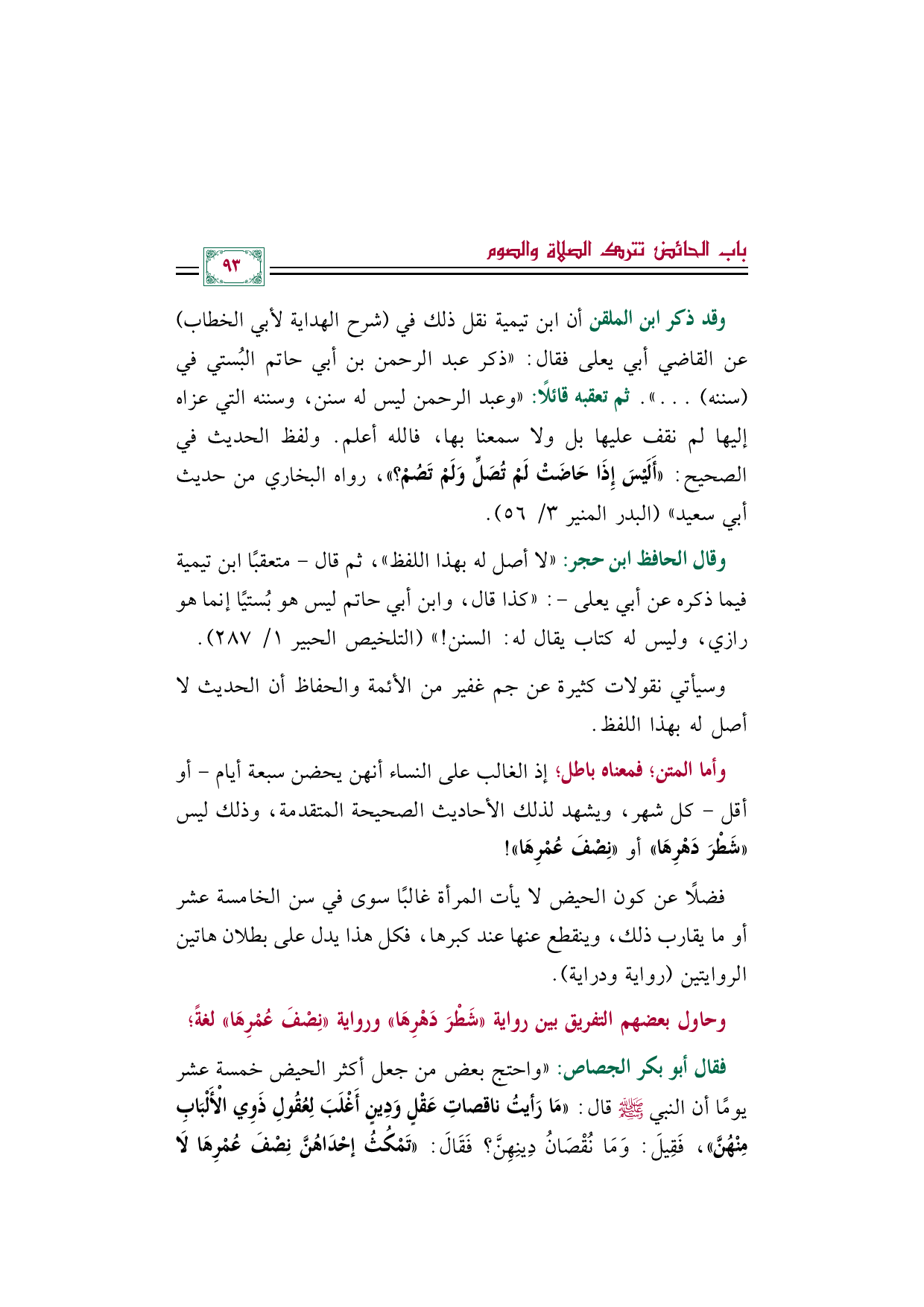 وقد ذكر ابن الملقن أن ابن تيمية نقل ذلك في (شرح الهداية لأبي الخطاب) عن القاضي أبي يعلى فقال: "ذكر عبد الرحمن بن أبي حاتم البُستي في (سننه) ... ". ثم تعقبه قائلًا: "وعبد الرحمن ليس له سنن، وسننه التي عزاه إليها لم نقف عليها بل ولا سمعنا بها، فالله أعلم. ولفظ الحديث في الصحيح: ((أَلَيْسَ إِذَا حَاضَتْ لَمْ تُصَلِّ وَلَمْ تَصُمْ؟ ))، رواه البخاري من حديث أبي سعيد" (البدر المنير ٣/ ٥٦).