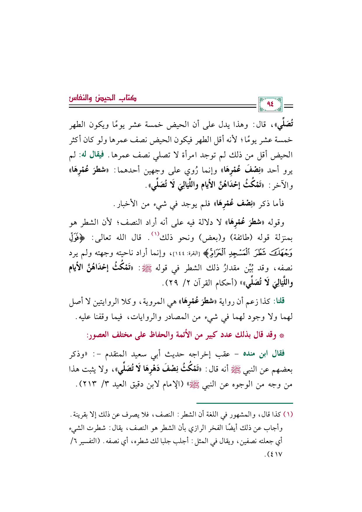 وقوله ((شطرَ عُمْرِهَا)) لا دلالة فيه على أنه أراد النصف؛ لأن الشطر هو بمنزلة قوله (طائفة) و (بعض) ونحو ذلك (¬١). قال الله تعالى: {فَوَلِّ وَجْهَكَ شَطْرَ الْمَسْجِدِ الْحَرَامِ} [البقرة: ١٤٤]، وإنما أراد ناحيته وجهته ولم يرد نصفه، وقد بُيِّن مقدارُ ذلك الشطر في قوله صلى الله عليه وسلم: ((تَمْكُثُ إحْدَاهُنَّ الأيام واللَّيَالِيَ لَا تُصَلِّي)) " (أحكام القرآن ٢/ ٢٩).