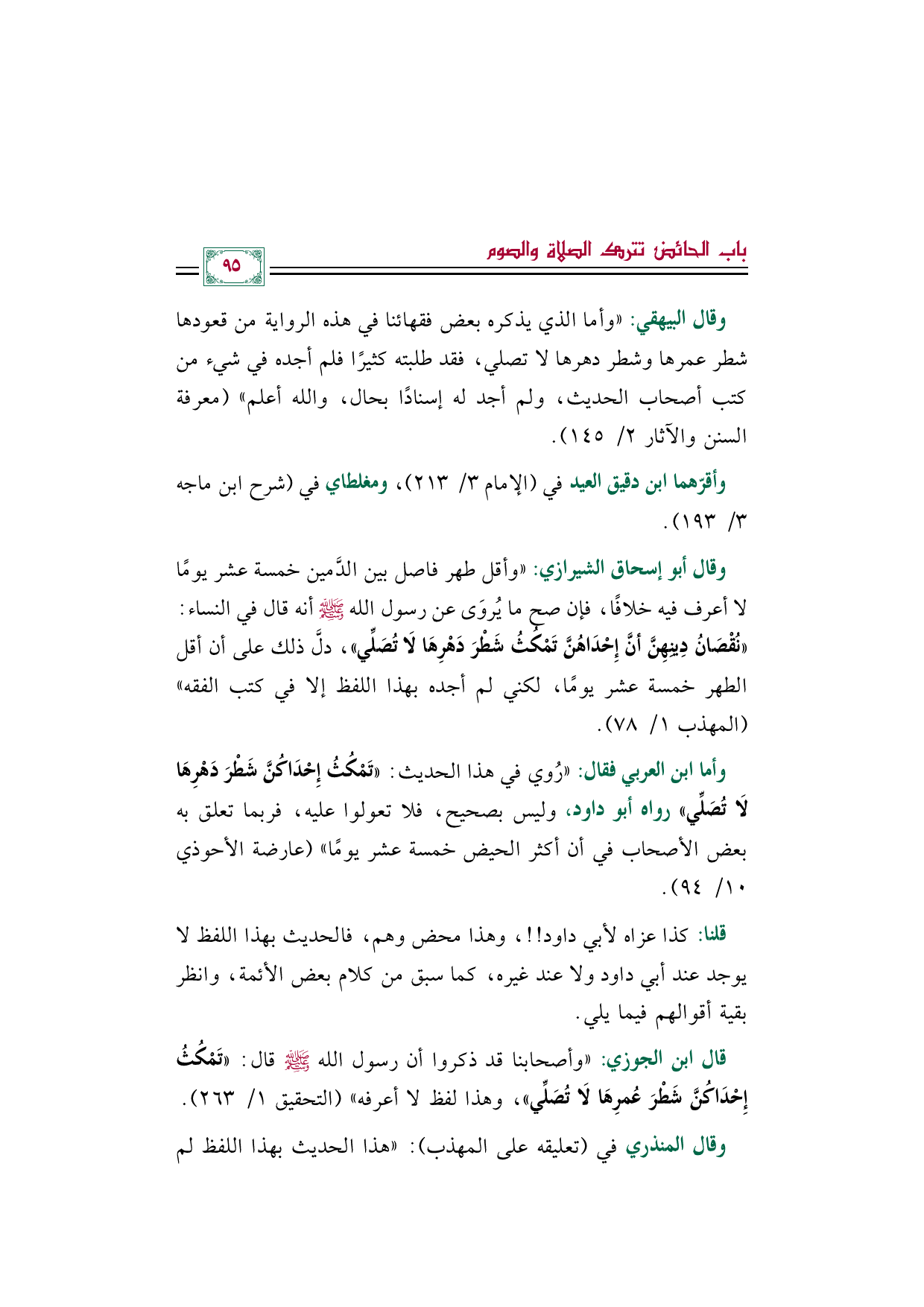 وقال البيهقي: ((وأما الذي يذكره بعض فقهائنا في هذه الرواية من قعودها شطر عمرها وشطر دهرها لا تصلي، فقد طلبته كثيرًا فلم أجده في شيء من كتب أصحاب الحديث، ولم أجد له إسنادًا بحال، والله أعلم)) (معرفة السنن والآثار ٢/ ١٤٥).