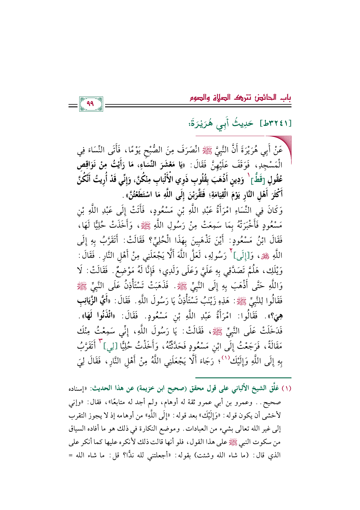 ◼ عَنْ أَبِي هُرَيْرَةَ أَنَّ النَّبِيَّ صلى الله عليه وسلم انْصَرَفَ مِنَ الصُّبْحِ يَوْمًا، فَأَتَى النِّسَاءَ فِي الْمَسْجِدِ، فَوَقَفَ عَلَيْهِنَّ فَقَالَ: ((يَا مَعْشَرَ النِّسَاءِ، مَا رَأَيْتُ مِنْ نَوَاقِصِ عُقُولٍ [قَطُّ] ١ وَدِينٍ أَذْهَبَ بِقُلُوبِ ذَوِي الْأَلْبَابِ مِنْكُنَّ، وَإِنِّي قَدْ أُرِيتُ أَنَّكُنَّ أَكْثَرَ أَهْلِ النَّارِ يَوْمَ الْقِيَامَةِ؛ فَتَقَّرَبْنَ إِلَى اللَّهِ مَا اسْتَطَعْتُنَّ)).