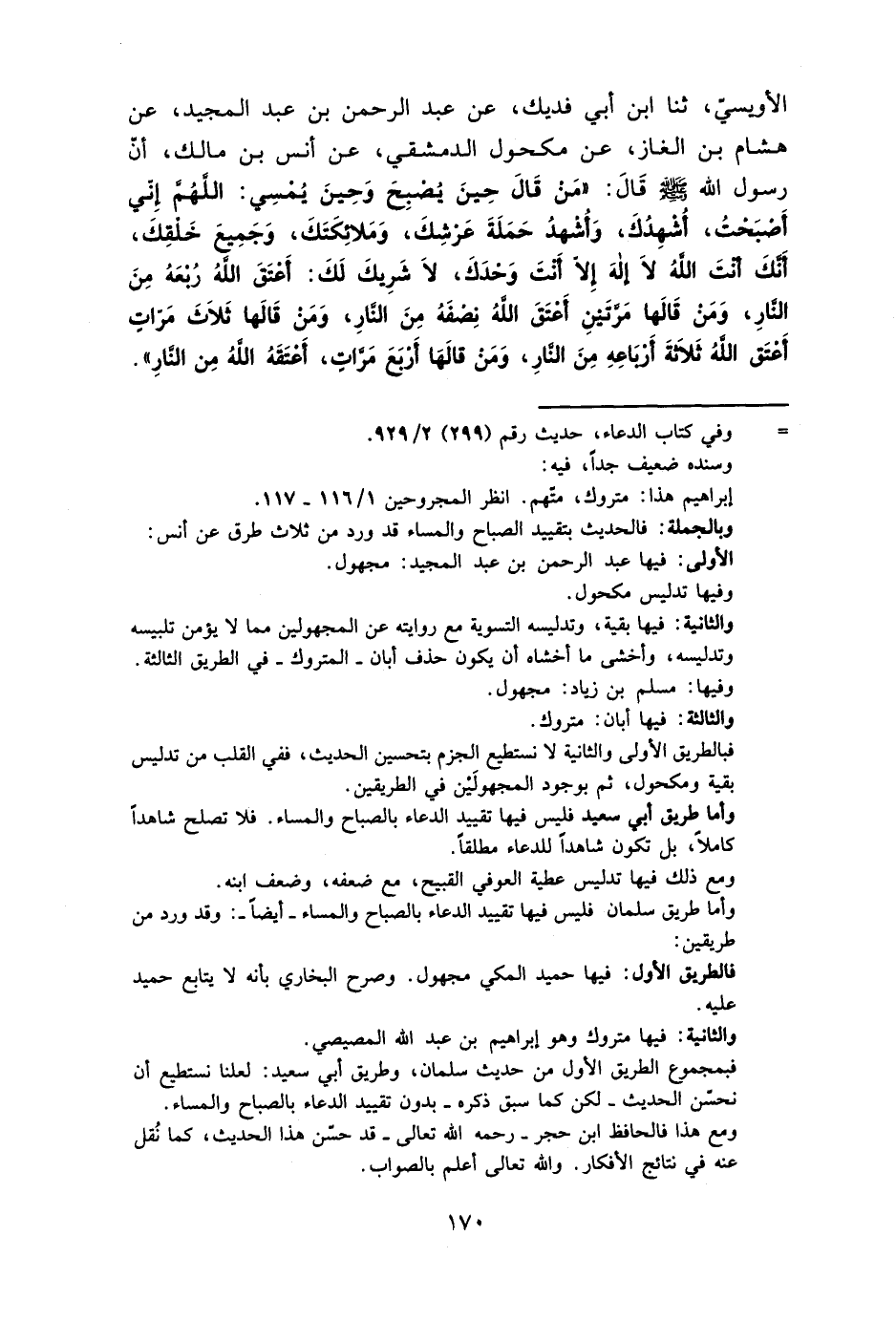 الأويسي ثَنَا ابْنُ أَبِي فُدَيْكٍ عَنْ عَبْدِ الرَّحْمَنِ بْنِ عَبْدِ الْمَجِيدِ عَنْ هِشَامِ بْنِ الْغَازِ عَنْ مَكْحُولٍ الدِّمَشْقِيِّ عَنْ أَنَسِ بْنِ مَالِكِ أَن رَسُول الله قَالَ (مَنْ قَالَ حِينَ يُصْبِحُ وَحِينَ يُمْسِي اللَّهُمَّ إِنِّي أَصْبَحْتُ أُشْهِدُكَ وَأُشْهِدُ حَمَلَةَ عَرْشِكَ ومَلائِكَتَكَ وَجَمِيعَ خَلْقِكَ أَنَّكَ أَنْتَ اللَّهُ لَا إِلَهَ إِلا أَنْتَ وَحْدَكَ لَا شَرِيكَ لَكَ أَعْتَقَ اللَّهُ رُبُعَهُ مِنَ النَّارِ وَمَنْ قَالَهَا مَرَّتَيْنِ أَعْتَقَ اللَّهُ نِصْفَهُ مِنِ النَّارِ وَمَنْ قَالَهَا ثَلاثَ مَرَّاتٍ أَعْتَقَ اللَّهُ ثَلاثَةَ أَرْبَاعِهِ مِنِ النَّارِ وَمَنْ قَالَهَا أَرْبَعَ مَرَّاتٍ أعْتقهُ الله من النَّار) // سَنَده ضَعِيف //