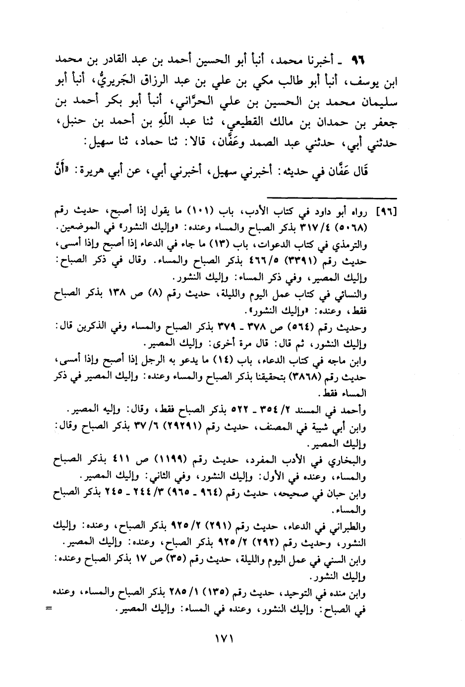 96 - أخبرنَا مُحَمَّد أنبأ أَبُو الْحُسَيْنِ أَحْمَدُ بْنُ عَبْدِ الْقَادِر بن مُحَمَّد ابْن يُوسُف أنبأ أَبُو طَالِبٍ مَكِّيُّ بْنُ عَلِيِّ بن عبد الرَّزَّاق الْجريرِي أنبأ أَبُو سُلَيْمَانَ مُحَمَّدُ بْنُ الْحُسَيْنِ بن عَليّ الْحَرَّانِي أَنْبَأَ أَبُو بَكْرٍ أَحْمَدُ بْنُ جَعْفَرِ بْنِ حَمْدَانَ بْنِ مَالِكٍ الْقَطِيعِيُّ ثَنَا عَبْدُ اللَّهِ بْنُ أَحْمَدَ بْنِ حَنْبَلٍ حَدَّثَنِي أَبِي حَدَّثَنِي عَبْدُ الصَّمَدِ وَعَفَّانُ قَالا ثَنَا حَمَّاد ثَنَا سُهَيْلٌ قَالَ عَفَّانُ فِي حَدِيثِهِ أَخْبَرَنِي سُهَيْلٌ أَخْبَرَنِي أَبِي عَنْ أَبِي هُرَيْرَةَ (أَنَّ