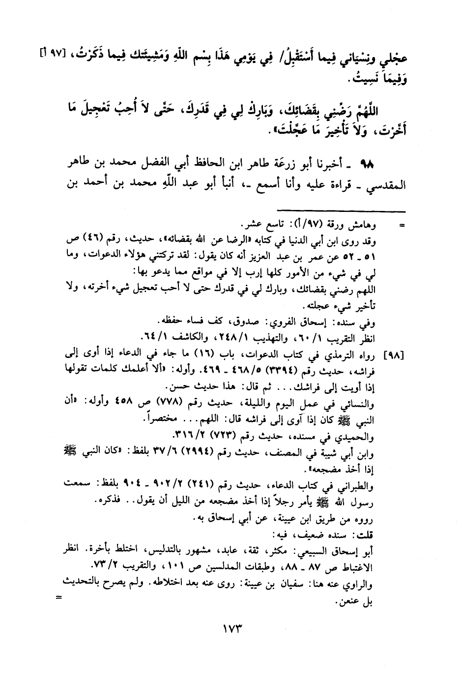 98 - أخبرنَا أَبُو زرْعَة طَاهِر ابْن الْحَافِظِ أَبِي الْفَضْلِ مُحَمَّدِ بْنِ طَاهِرٍ الْمَقْدِسِيُّ قِرَاءَةً عَلَيْهِ وأَنَا أسمع أنبأ أَبُو عَبْدِ اللَّهِ مُحَمَّدُ بْنُ أَحْمد بن