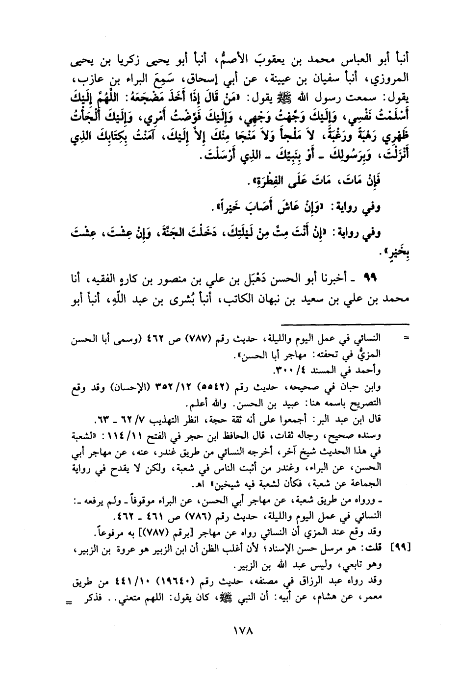 أنبأ أَبُو الْعَبَّاسِ مُحَمَّدُ بْنُ يَعْقُوبَ الْأَصَم أنبأ أَبُو يَحْيَى زَكَرِيَّا بْنُ يَحْيَى الْمروزِي أنبأ سُفْيَانُ بْنُ عُيَيْنَةَ عَنْ أَبِي إِسْحَاقَ سَمِعَ الْبَرَاءَ بْنَ عَازِبٍ يَقُول سَمِعت رَسُول الله يَقُولُ (مَنْ قَالَ إِذَا أَخَذَ مَضْجَعَهُ اللَّهُمَّ إِلَيْكَ أَسْلَمْتُ نَفْسِي وَإِلَيْكَ وَجَّهْتُ وَجْهِي وَإِلَيْكَ فَوَّضْتُ أَمْرِي وَإِلَيْكَ أَلْجَأْتُ ظَهْرِي رَهْبَةً ورَغْبَةً لَا مَلْجَأَ وَلَا مَنْجَا مِنْكَ إِلا إِلَيْكَ آمَنْتُ بِكِتَابِكَ الَّذِي أَنْزَلْتَ وَبِرَسُولِكَ أَوْ بِنَبِيِّكَ الَّذِي أَرْسَلْتَ فَإِنْ مَاتَ مَاتَ على الْفطْرَة) // سَنَده ضَعِيف // وَفِي رِوَايَةٍ (وإِنْ عَاشَ أَصَابَ خَيْرًا وَفِي رِوَايَةٍ إِنْ أَنْتَ مِتُّ مِنْ لَيْلَتِكَ دَخَلْتَ الْجَنَّةَ وإِنْ عِشْتَ عِشْتَ بِخَيْرٍ)