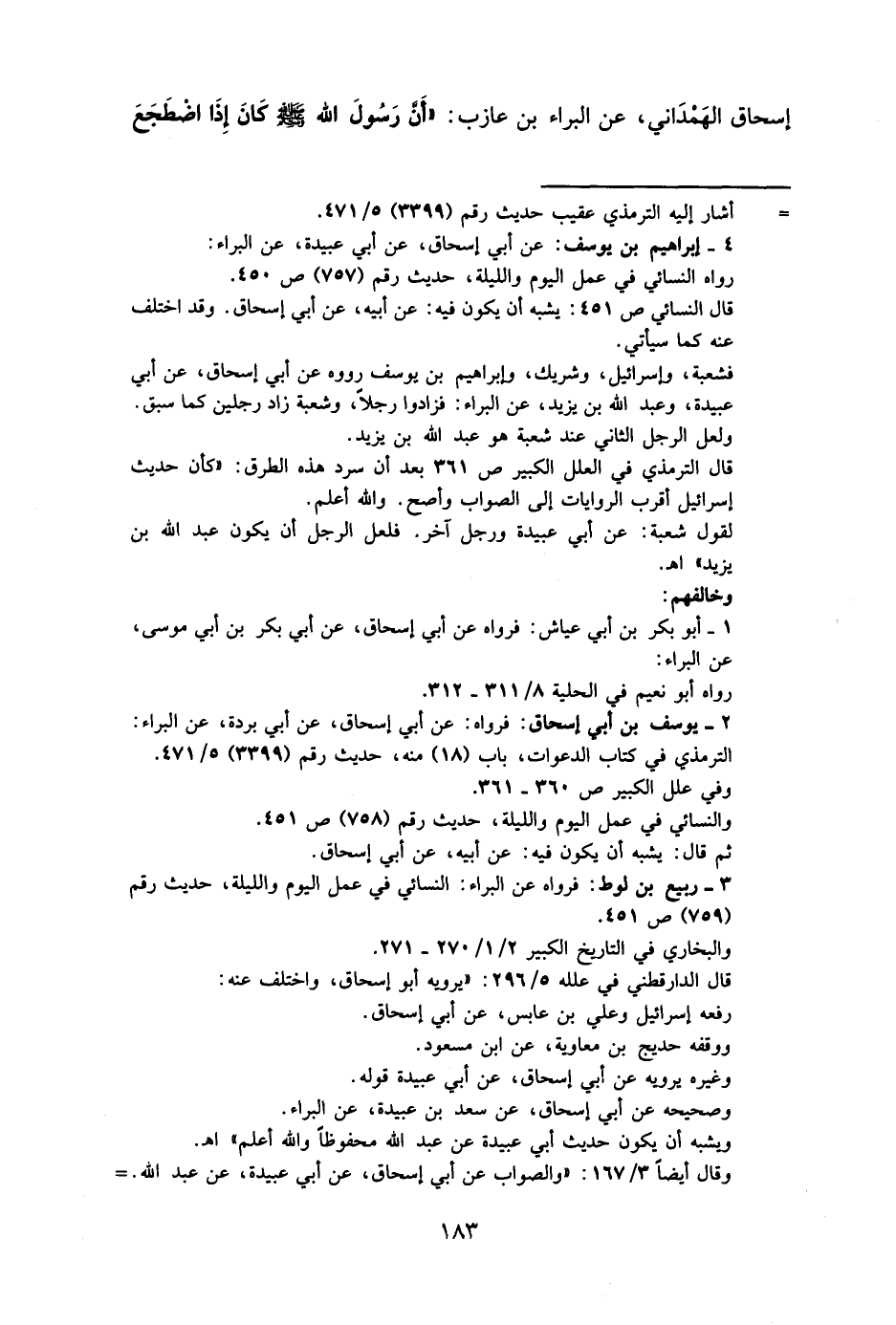 إِسْحَاقَ الْهَمْدَانِيُّ عَنِ الْبَرَاءِ بْنِ عَازِب أَن رَسُول الله كَانَ إِذَا اضْطَجَعَ