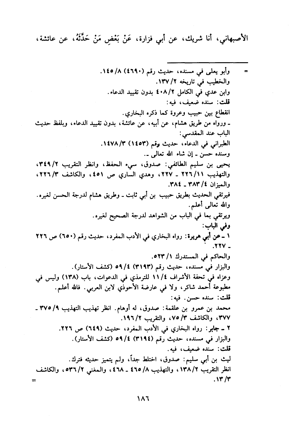 الْأَصْبَهَانِيّ أَنا شَرِيكٌ عَنْ أَبِي فَزَارَةَ عَنْ بَعْضِ مَنْ حَدَّثَهُ عَنْ عَائِشَةَ