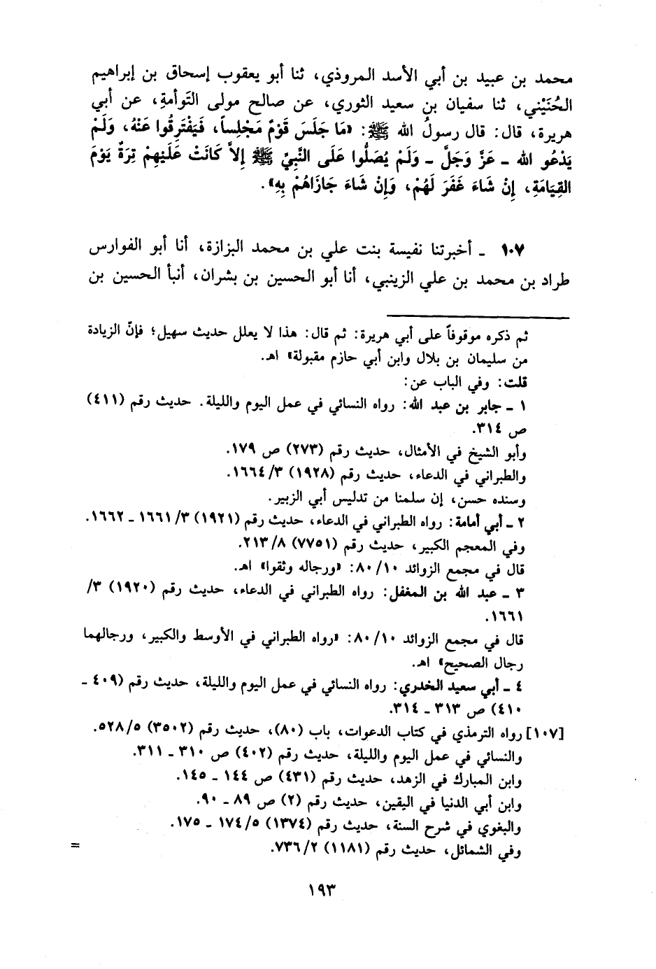 مُحَمَّد بن عبيد بن أبي الْأسد الْمَرْوذِيّ ثَنَا أَبُو يَعْقُوبَ إِسْحَاقُ بْنُ إِبْرَاهِيمَ الحنيني ثَنَا سُفْيَانُ بْنُ سَعِيدٍ الثَّوْرِيُّ عَنْ صَالح مولى التَّوْأَمَة عَنْ أَبِي هُرَيْرَةَ قَالَ قَالَ رَسُول الله (مَا جلس قوم مَجْلِسا فيفترقوا عَنهُ وَلم يَدْعُو اللَّهَ عَزَّ وَجَلَّ ولَمْ يُصَلُّوا على النَّبِي إِلا كَانَتْ عَلَيْهِمْ تِرَةٌ يَوْمَ الْقِيَامَةِ إِنْ شَاءَ غَفَرَ لَهُمْ وَإِن شَاءَ جازاهم بِهِ) // سندة حسن // أَخْبَرَتْنَا نَفِيسَةُ بِنْتُ عَلِيِّ بْنِ مُحَمَّد البزارة أَنا أَبُو الْفَوَارِسِ طِرَادُ بْنُ مُحَمَّدِ بن عَليّ الزَّيْنَبِي أَنا أَبُو الْحُسَيْن بن بَشرَان أنبأ الْحُسَيْن بن