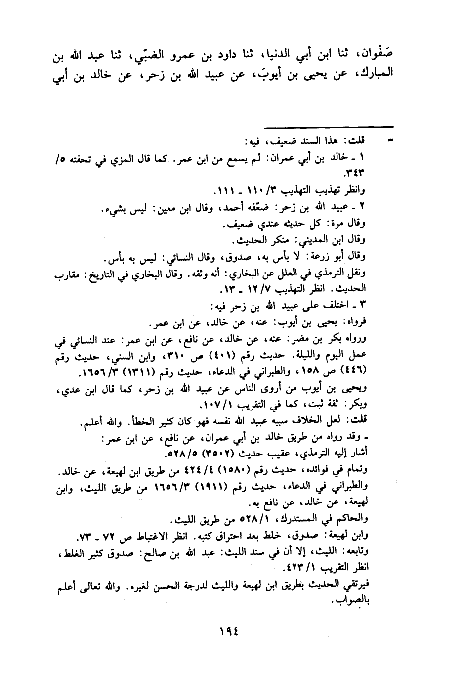 صَفْوَان ثَنَا ابْن أبي الدُّنْيَا ثَنَا دَاوُد بن عَمْرو الضَّبِّيّ ثَنَا عَبْدُ اللَّهِ بْنُ الْمُبَارَكِ عَنْ يَحْيَى بْنِ أَيُّوبَ عَنْ عُبَيْدِ اللَّهِ بْنِ زَحْرٍ عَنْ خَالِدِ بْنِ أَبِي