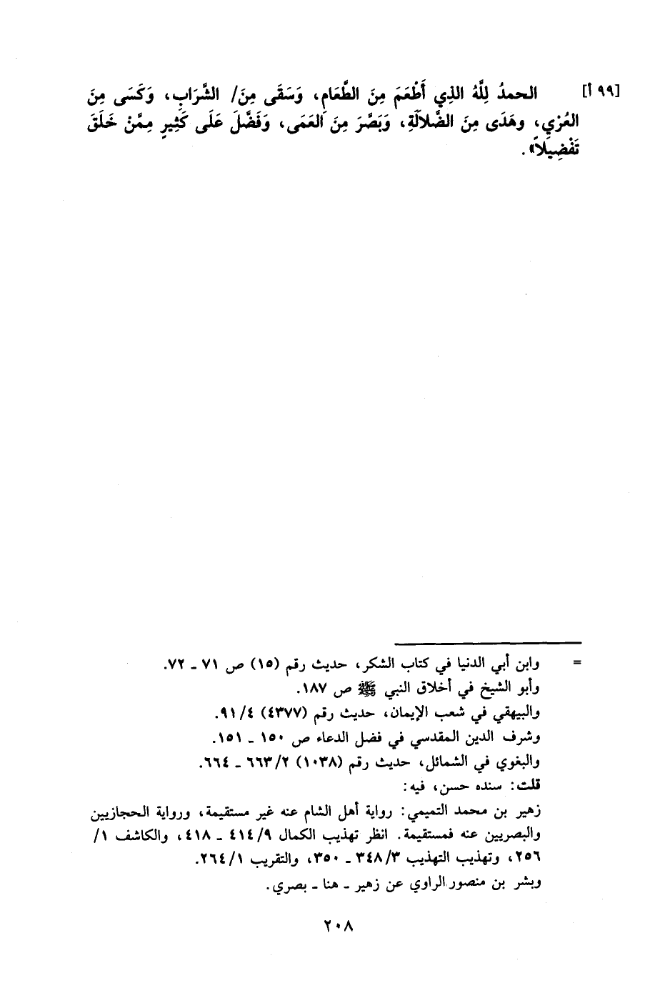 الْحَمْدُ لِلَّهِ الَّذِي أَطْعَمَ مِنَ الطَّعَام وَسَقَى من / الشَّرَاب وكسى مِنَ الْعُرْيِ وَهَدَى مِنَ الضَّلالَةِ وَبَصَّرَ مِنَ الْعَمَى وَفَضَّلَ عَلَى كثير مِمَّن خلق تَفْضِيلًا) // سَنَده حسن //