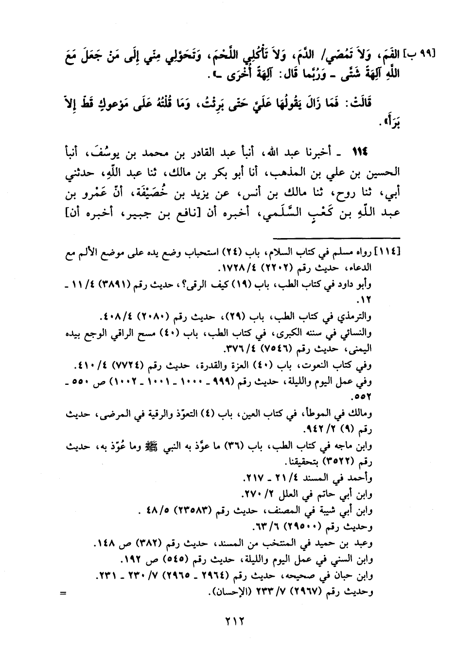 114 - أخبرنَا عبد الله أَنْبَأَ عَبْدُ الْقَادِرِ بْنُ مُحَمَّدٍ بن يُوسُف أنبأ الْحُسَيْن بن عَليّ بن الْمَذْهَب أَنا أَبُو بَكْرِ بْنُ مَالِكٍ ثَنَا عبد الله حَدثنِي أبي ثَنَا روح ثَنَا مَالِكُ بْنُ أَنَسٍ عَنْ يَزِيدَ بن خصيفَة أَن عَمْرو بْنَ عَبْدِ اللَّهِ بْنِ كَعْبٍ السّلمِيّ أخبرهُ أَن نَافِع بن جُبَير أَخْبَرَهُ أَنَّ