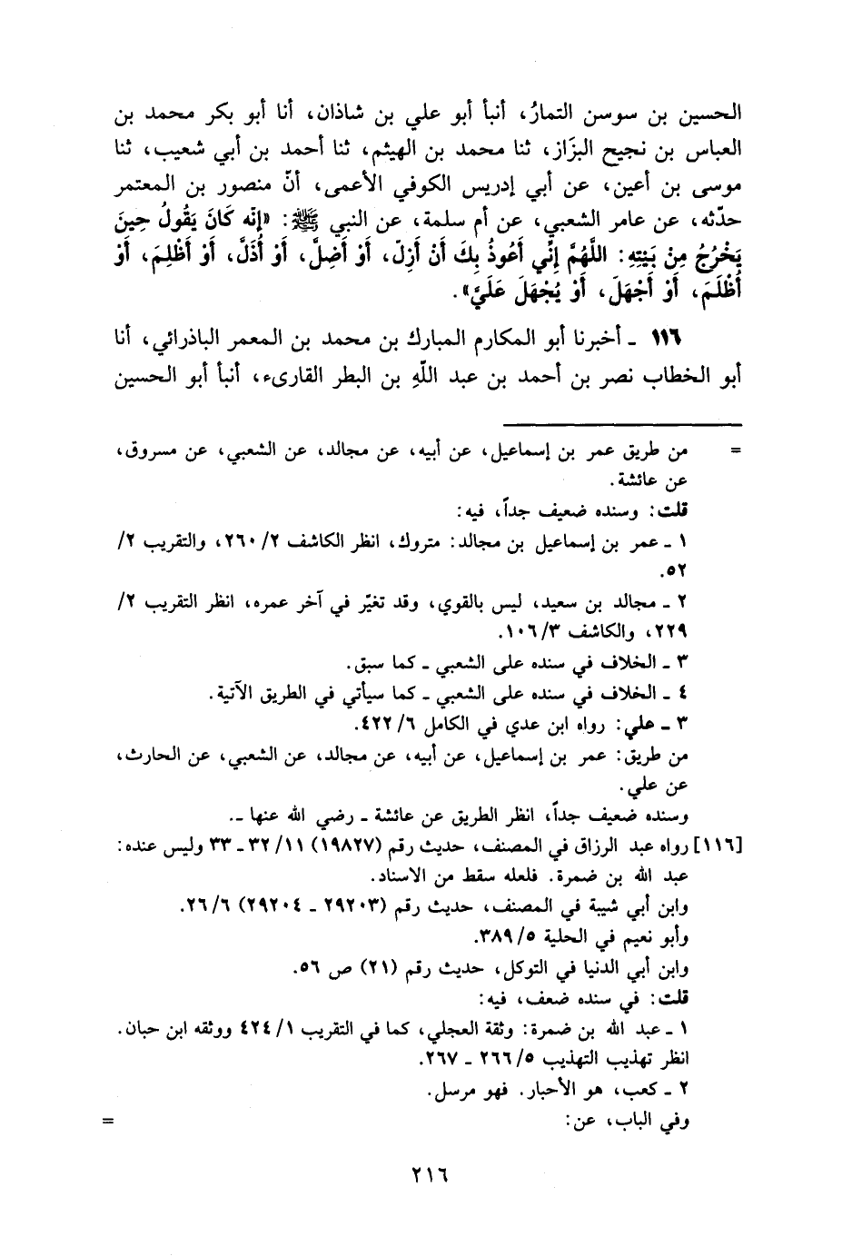الْحُسَيْنِ بْنِ سُوسَنٍ التَّمَّارُ أَنْبَأَ أَبُو عَليّ بن شَاذان أَنا أَبُو بَكْرٍ مُحَمَّدُ بْنُ الْعَبَّاسِ بن نجيح الْبَزَّاز ثَنَا مُحَمَّد بن الْهَيْثَم ثَنَا أَحْمد بن أبي شُعَيْب ثَنَا مُوسَى بْنُ أَعْيَنَ عَنْ أَبِي إِدْرِيسَ الْكُوفِيِّ الأَعْمَى أَنَّ مَنْصُورَ بْنَ الْمُعْتَمِرِ حَدَّثَهُ عَنْ عَامِرٍ الشَّعْبِيِّ عَنْ أُمِّ سَلَمَةَ عَنِ النَّبِي (أَنَّهُ كَانَ يَقُولُ حِينَ يَخْرُجُ مِنْ بَيْتِهِ اللَّهُمَّ إِنِّي أَعُوذُ بِكَ أَنْ أَزِلَّ أَوْ أَضِلَّ أَوْ أَذِلَّ أَوْ أَظْلِمَ أَوْ أُظْلَمَ أَوْ أَجْهَلَ أَوْ يُجْهَلَ عَلَيَّ)