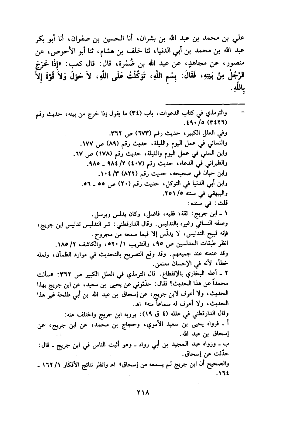 عَلِيُّ بْنُ مُحَمَّدِ بْنِ عَبْدِ الله بن بَشرَان أَنا الْحُسَيْن بن صَفْوَان أَنا أَبُو بَكْرٍ عَبْدُ اللَّهِ بْنُ مُحَمَّد بن أبي الدُّنْيَا ثَنَا خلف بن هِشَام ثَنَا أَبُو الأَحْوَصِ عَنْ مَنْصُورٍ عَنْ مُجَاهِدٍ عَنْ عَبْدِ اللَّهِ بْنِ ضَمْرَةَ قَالَ قَالَ كَعْبٌ (إِذَا خَرَجَ الرَّجُلُ مِنْ بَيْتِهِ فَقَالَ بِسْمِ اللَّهِ تَوَكَّلْتُ عَلَى اللَّهِ لَا حَوْلَ وَلَا قُوَّةَ إِلا بِاللَّهِ