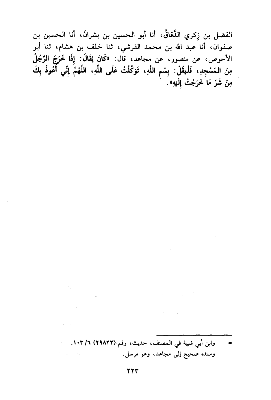 الْفضل بن زكري الدقاق أَنا أَبُو الْحُسَيْن بن بَشرَان أَنا الْحُسَيْن بن صَفْوَان أَنا عَبْدُ اللَّهِ بْنُ مُحَمَّدٍ الْقُرَشِيُّ ثَنَا خلف بن هِشَام ثَنَا أَبُو الأَحْوَصِ عَنْ مَنْصُورٍ عَنْ مُجَاهِدٍ قَالَ (كَانَ يُقَالُ إِذَا خَرَجَ الرَّجُلُ مِنَ الْمَسْجِدِ فَلْيَقُلْ بِسْمِ اللَّهِ تَوَكَّلْتُ عَلَى اللَّهِ اللَّهُمَّ إِنِّي أَعُوذُ بِكَ مِنْ شَرّ مَا خرجت إِلَيْهِ)