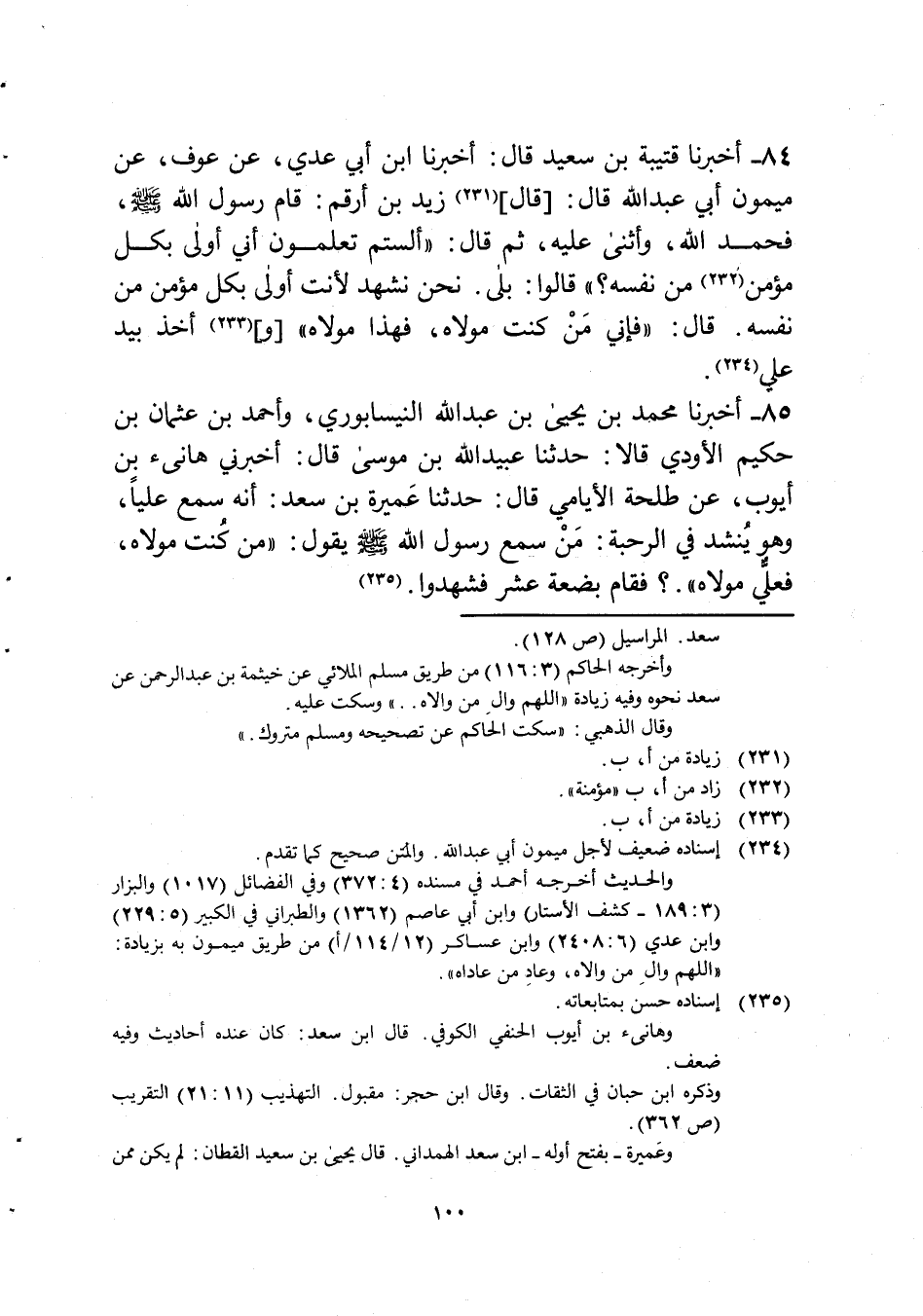 84 - أخبرنَا قُتَيْبَة بن سعيد قَالَ أخبرنَا ابْن أبي عدي عَن عَوْف عَن مَيْمُون أبي عبد الله قَالَ قَالَ زيد بن أَرقم قَامَ رَسُول الله صلى الله عَلَيْهِ وَسلم فَحَمدَ الله وَأثْنى عَلَيْهِ ثمَّ قَالَ ألستم تعلمُونَ أَنِّي أولى بِكُل مُؤمن من نَفسه قَالُوا بلَى نَحن نشْهد لأَنْت أولى بِكُل مُؤمن من نَفسه قَالَ فَإِنِّي من كنت مَوْلَاهُ فَهَذَا مَوْلَاهُ وَأخذ بيد عَليّ