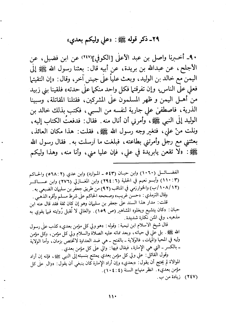 - 29 ذكر قَوْله صلى الله عَلَيْهِ وَسلم وَلِيكُم بعدِي أخبرنَا وَاصل بن عبد الْأَعْلَى الْكُوفِي عَن ابْن ف عبد الله بن بُرَيْدَة عَن أَبِيه قَالَ بعثنَا رَسُول الله صلى الله عَلَيْهِ وَسلم إِلَى الْيمن مَعَ خَالِد بن الْوَلِيد وَبعث عليا على جَيش آخر وَقَالَ إِن التقيتما فعلي على النَّاس وَإِن تفرقتما فَكل وَاحِد مِنْكُمَا على حِدته فلقينا بني زبيد من أهل الْيمن وَظهر الْمُسلمُونَ على الْمُشْركين فَقَتَلْنَا الْمُقَاتلَة وَسَبَيْنَا الذُّرِّيَّة فأصطفى عَليّ جَارِيَة لنَفسِهِ من السَّبي فَكتب بذلك خَالِد بن الْوَلِيد إِلَى النَّبِي صلى الله عَلَيْهِ وَسلم وَأَمرَنِي أَن أنال مِنْهُ فَقَالَ فَدفعت الْكتاب إِلَيْهِ ونلت من عَليّ فَتغير وَجه رَسُول الله صلى الله عَلَيْهِ وَسلم فَقلت هَذَا مَكَان العائذ بعثتني مَعَ رجل وأمرتني بِطَاعَتِهِ فبلغت مَا أرْسلت بِهِ فَقَالَ رَسُول الله صلى الله عَلَيْهِ وَسلم لَا تقعن يَا بُرَيْدَة فِي عَليّ فَإِن عليا مني وَأَنا مِنْهُ وَهَذَا وَلِيكُم