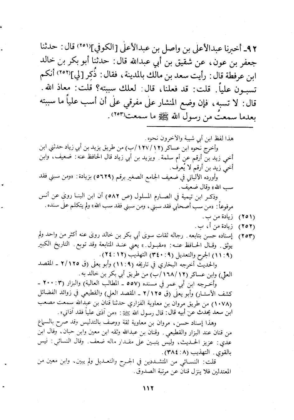 92 - أخبرنَا عبد الْأَعْلَى بن وَاصل بن عبد الْأَعْلَى الْكُوفِي قَالَ حَدثنَا جَعْفَر بن عون عَن شَقِيق بن أبي عبد الله قَالَ حَدثنَا أَبُو بكر بن خَالِد ابْن عرفطة قَالَ رَأَيْت سعد بن مَالك بِالْمَدِينَةِ فَقَالَ ذكر لي أَنكُمْ تسبون عليا قلت قد فعلنَا قَالَ لَعَلَّك سببته قلت معَاذ الله قَالَ لاتسبه فَإِن وضع الْمِنْشَار على مفرقي على أَن أسب عليا مَا سببته بَعْدَمَا سَمِعت من رَسُول الله صلى الله عَلَيْهِ وَسلم مَا سَمِعت