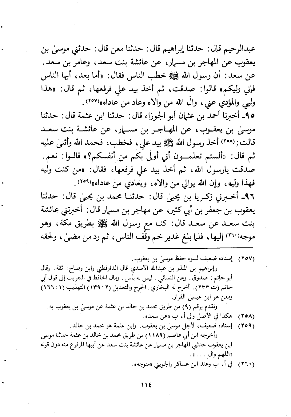 96 - أَخْبرنِي زَكَرِيَّا بن يحيى قَالَ حَدثنَا مُحَمَّد بن يحيى قَالَ حَدثنَا يَعْقُوب بن جَعْفَر بن أبي كثير عَن مهَاجر بن مِسْمَار قَالَ أَخْبَرتنِي عَائِشَة بنت سعد عَن سعد قَالَ كُنَّا مَعَ رَسُول الله صلى الله عَلَيْهِ وَسلم بطرِيق مَكَّة وَهُوَ موجه إِلَيْهَا فَلَمَّا بلغ غَدِير خم وقف النَّاس ثمَّ رد من مضى ولحقه