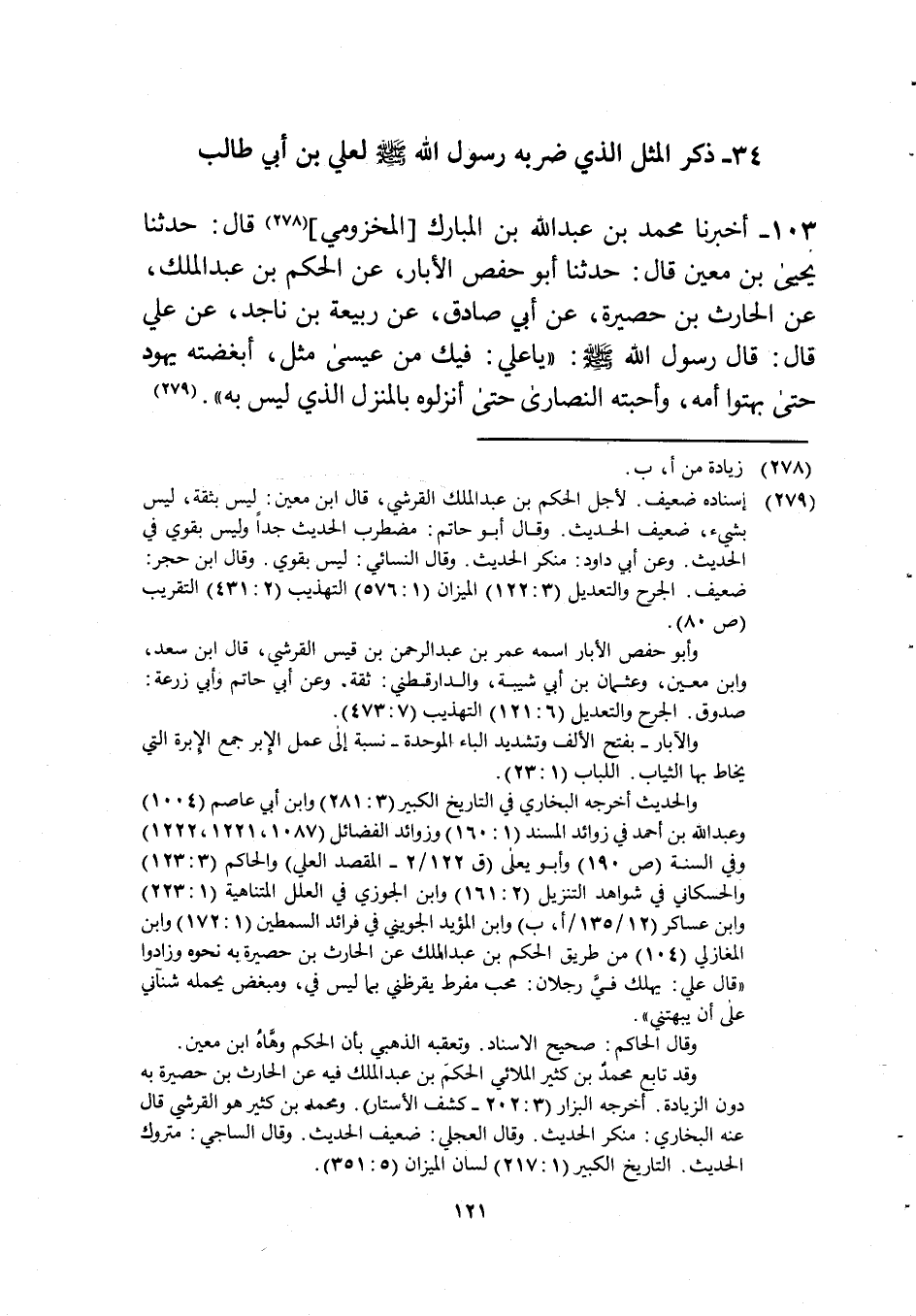 103 - أخبرنَا مُحَمَّد بن عبد الله بن الْمُبَارك المَخْزُومِي قَالَ حَدثنَا يحيى بن معِين قَالَ حَدثنَا أَبُو حَفْص الْأَبَّار عَن الحكم بن عبد الْملك عَن الْحَارِث بن حصيرة عَن أبي صَادِق عَن ربيعَة بن ناجد عَن عَليّ قَالَ قَالَ رَسُول الله صلى الله عَلَيْهِ وَسلم يَا عَليّ فِيك من عِيسَى مثل أبغضته الْيَهُود حَتَّى بعثوا أمه وأحبته النَّصَارَى حَتَّى أنزلوه بالمنزل الَّذِي لَيْسَ بِهِ