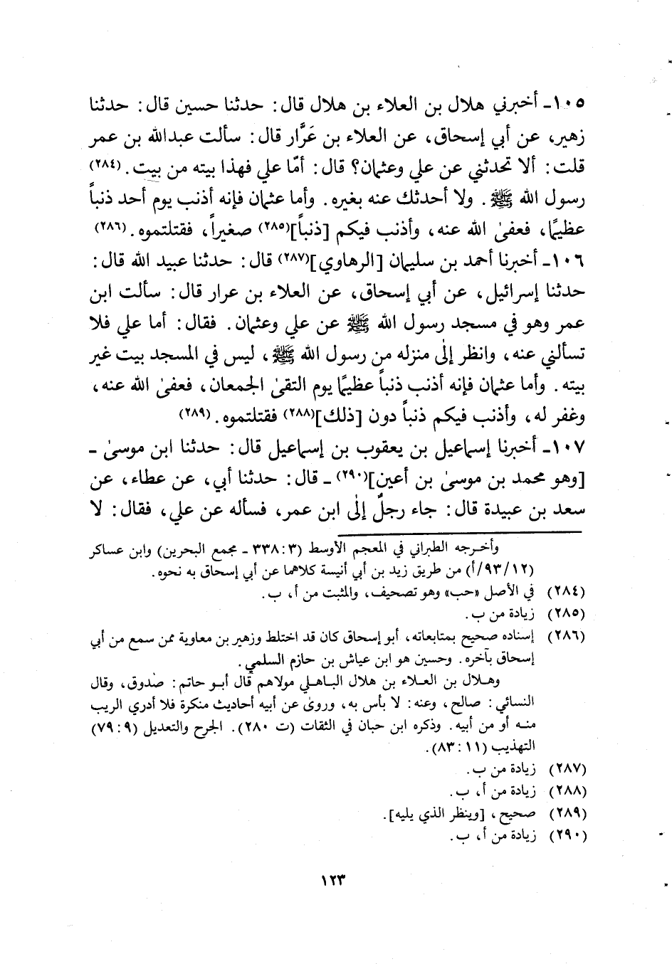105 - أَخْبرنِي هِلَال بن الْعَلَاء بن هِلَال قَالَ حَدثنَا حُسَيْن قَالَ حَدثنَا زُهَيْر عَن أبي إِسْحَاق عَن الْعَلَاء بن عرار قَالَ سَأَلت عبد الله بن عمر قلت أَلا تُحَدِّثنِي عَن عَليّ وَعُثْمَان قَالَ أما عَليّ فَهَذَا بَيته من بَيت رَسُول الله صلى الله عَلَيْهِ وَسلم وَلَا أحَدثك عَنهُ بِغَيْرِهِ وَأما عُثْمَان فَإِنَّهُ أذْنب يَوْم أحد ذَنبا عَظِيما فعفى الله عَنهُ وأذنب فِيكُم ذَنبا صَغِيرا فقتلتموه