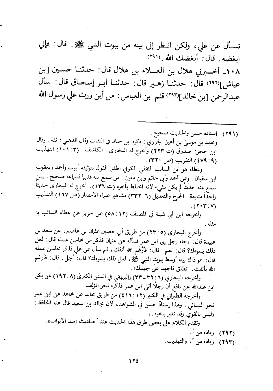108 - أخبرنَا هِلَال بن الْعَلَاء بن هِلَال قَالَ حَدثنَا حُسَيْن بن عَيَّاش قَالَ حَدثنَا زُهَيْر قَالَ حَدثنَا أَبُو إِسْحَاق قَالَ سَأَلَ عبد الرَّحْمَن بن خَالِد قثم بن الْعَبَّاس من أَيْن ورث عَليّ رَسُول الله