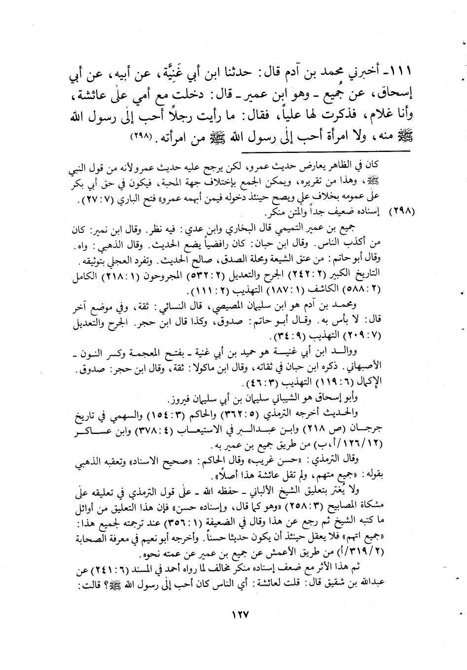 111 - أَخْبرنِي مُحَمَّد بن آدم قَالَ حَدثنَا ابْن أبي غنية عَن أَبِيه عَن أبي إِسْحَاق عَن جَمِيع وَهُوَ ابْن عُمَيْر قَالَ دخلت مَعَ أُمِّي على عَائِشَة وَأَنا غُلَام فَذكرت لَهَا عليا فَقَالَ مَا رَأَيْت رجلا أحب إِلَى رَسُول الله صلى الله عَلَيْهِ وَسلم مِنْهُ وَلَا امْرَأَة أحب إِلَى رَسُول الله صلى الله عَلَيْهِ وَسلم من امْرَأَته