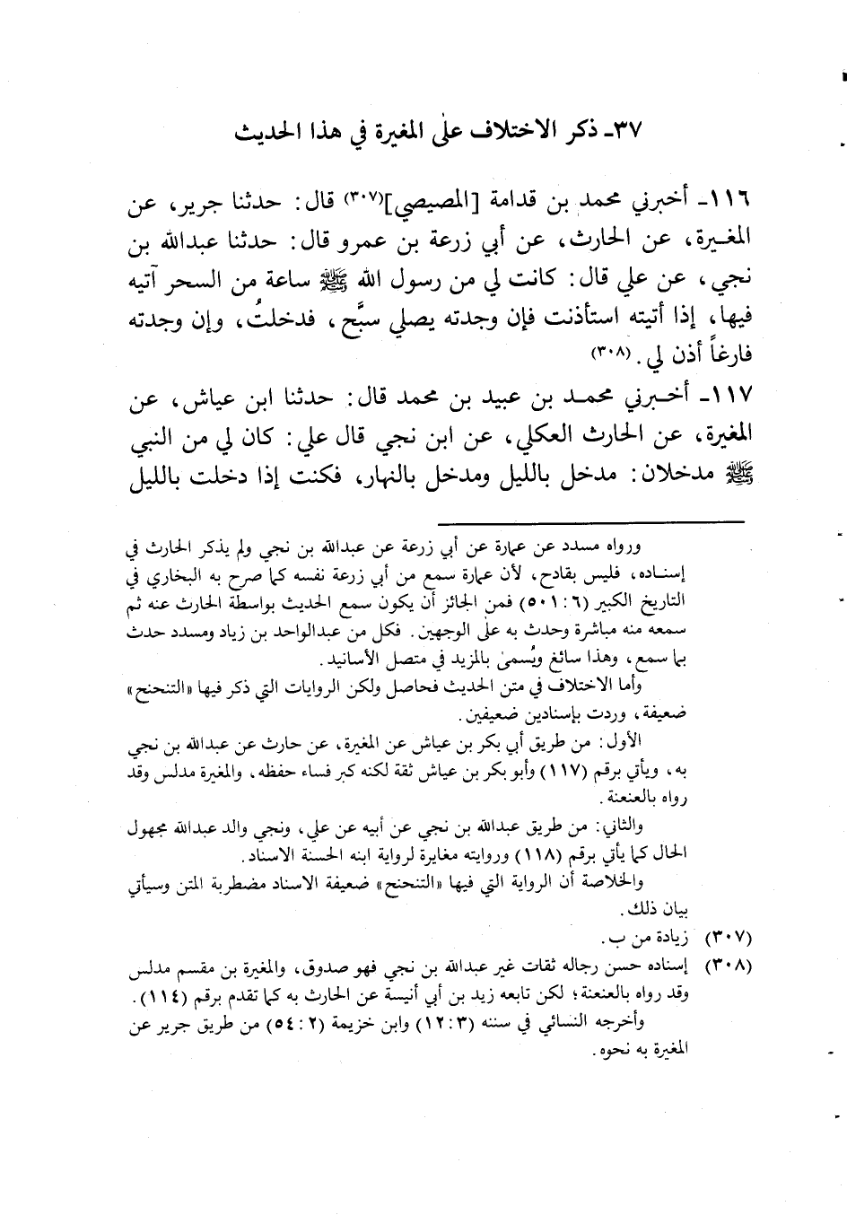 116 - أَخْبرنِي مُحَمَّد بن قدامَة المصِّيصِي قَالَ حَدثنَا جرير عَن الْمُغيرَة عَن الْحَارِث عَن أبي زرْعَة بن عَمْرو قَالَ حَدثنَا عبد الله بن نجي عَن عَليّ قَالَ كَانَت لي من رَسُول الله صلى الله عَلَيْهِ وَسلم سَاعَة من السحر أَتَيْته فِيهَا إِذا اسْتَأْذَنت فَإِن وجدته يُصَلِّي سبح فَدخلت وَإِن وجدته فَارغًا أذن لي