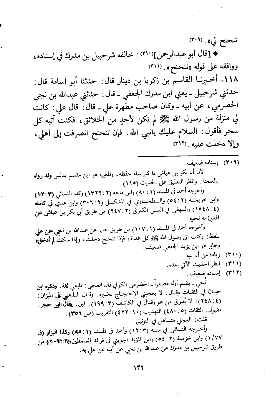 118 - أخبرنَا الْقَاسِم بن زَكَرِيَّا بن دِينَار قَالَ حَدثنَا أَبُو أُسَامَة قَالَ حَدثنِي شُرَحْبِيل يَعْنِي ابْن مدرك الْجعْفِيّ قَالَ حَدثنِي عبد الله بن نجي الْحَضْرَمِيّ عَن أَبِيه وَكَانَ صَاحب مطهرة عَليّ قَالَ قَالَ عَليّ كَانَت لي منزلَة من رَسُول الله صلى الله عَلَيْهِ وَسلم لم تكن لأحد من الْخَلَائق فَكنت آتيه كل سحر فَأَقُول السَّلَام عَلَيْك يَا نَبِي الله فَإِن تنحنح انصرفت إِلَى أَهلِي وَإِلَّا دخلت عَلَيْهِ